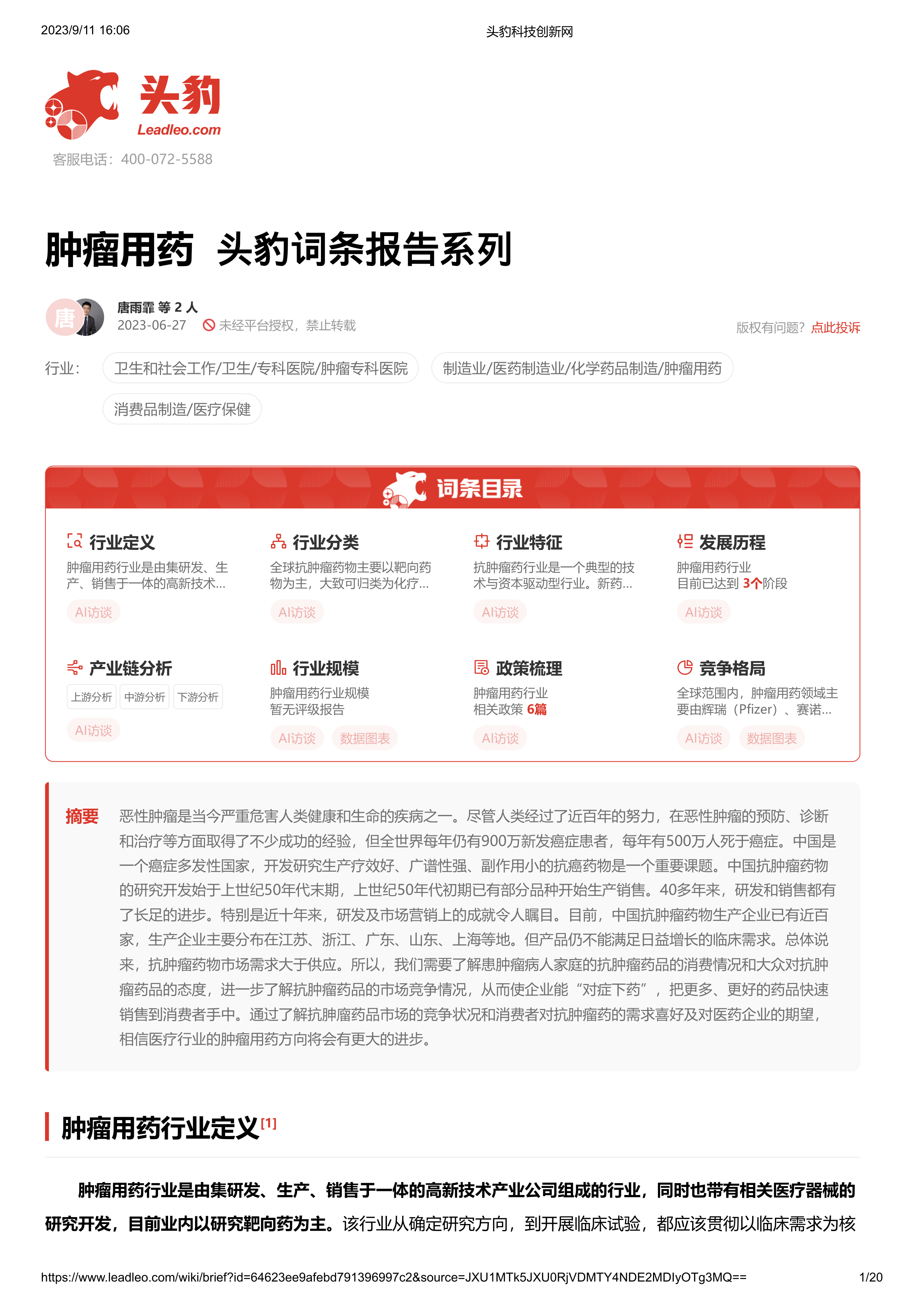 肿瘤用药 头豹词条报告系列