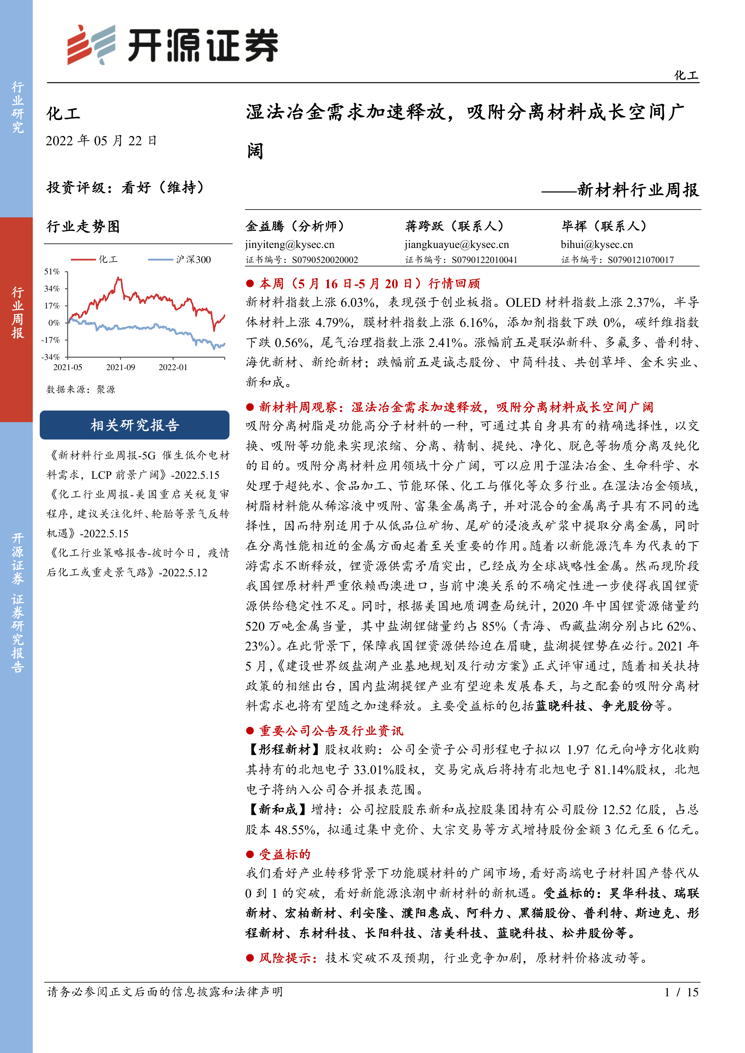 新材料周观察:湿法冶金需求加速释放,吸附分离材料成长空间广阔
