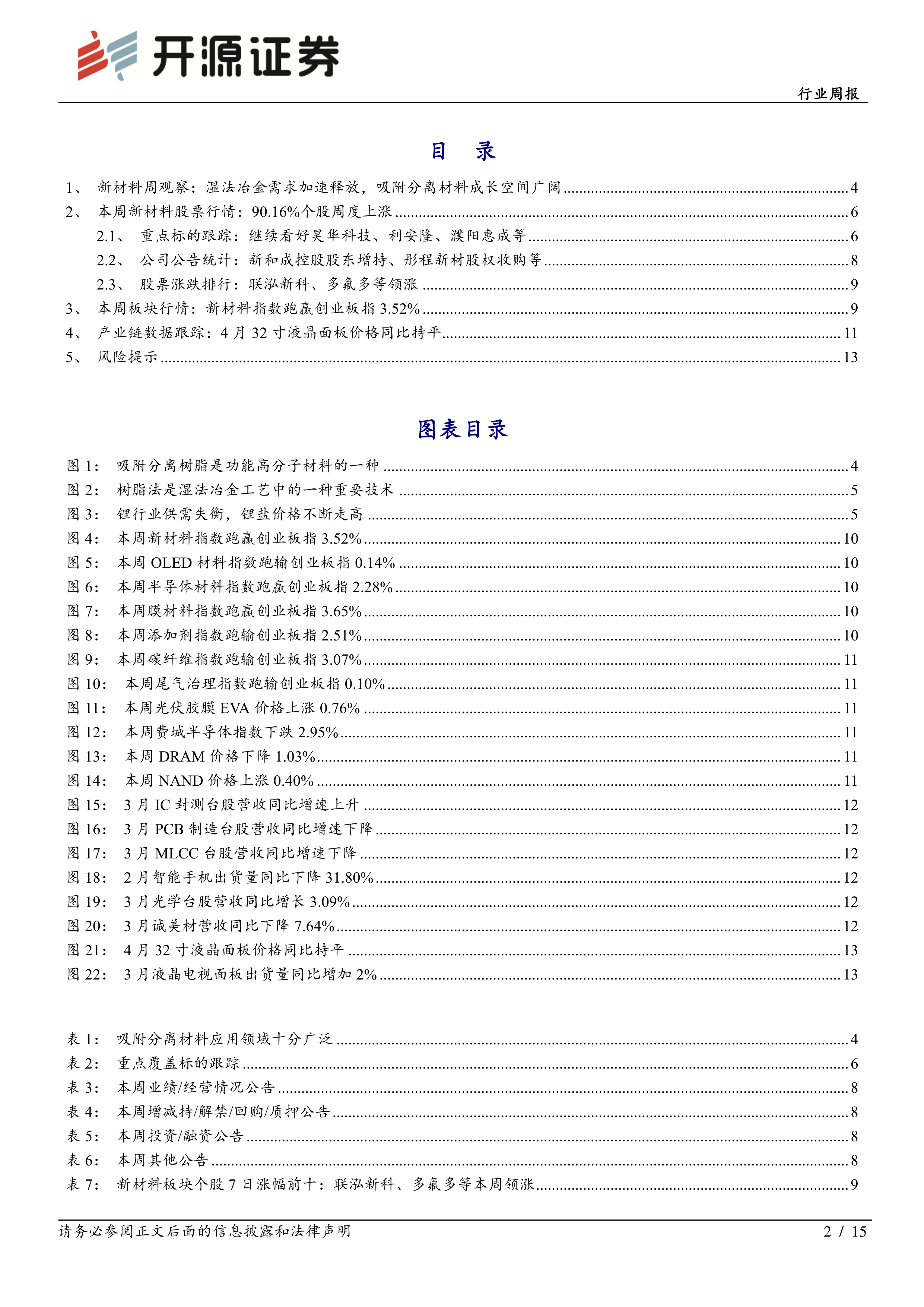 本报告的核心观点是:湿法冶金需求的加速释放为吸附分离材料带来了广阔的市场空间。 新能源汽车等下游需求的增长导致锂资源供需矛盾突出,促使国内盐湖提锂产业发展,进而带动吸附分离材料需求的快速增长。 同时,报告也分析了本周新材料行业整体市场表现,以及部分重点公司的动态。