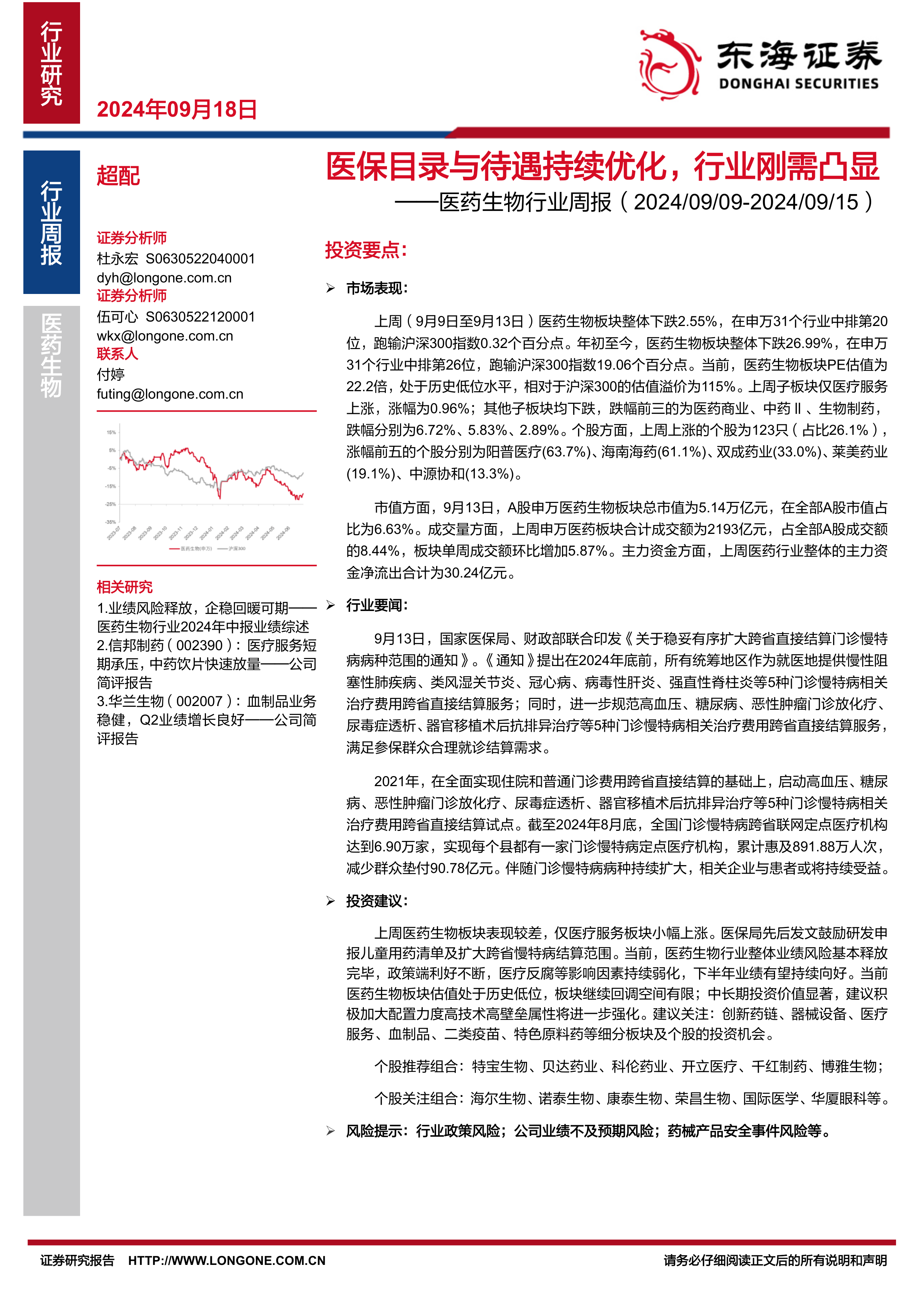 基于对市场表现和行业政策的分析,报告建议积极加大对医药生物板块的配置力度。 报告认为,行业整体业绩风险基本释放完毕,政策利好不断,医疗反腐等负面影响因素持续弱化,下半年业绩有望持续向好。 报告还推荐了具体的个股组合,并提示了潜在的风险因素。 建议关注创新药链、器械设备、医疗服务、血制品、二类疫苗、特色原料药等细分板块及个股的投资机会。