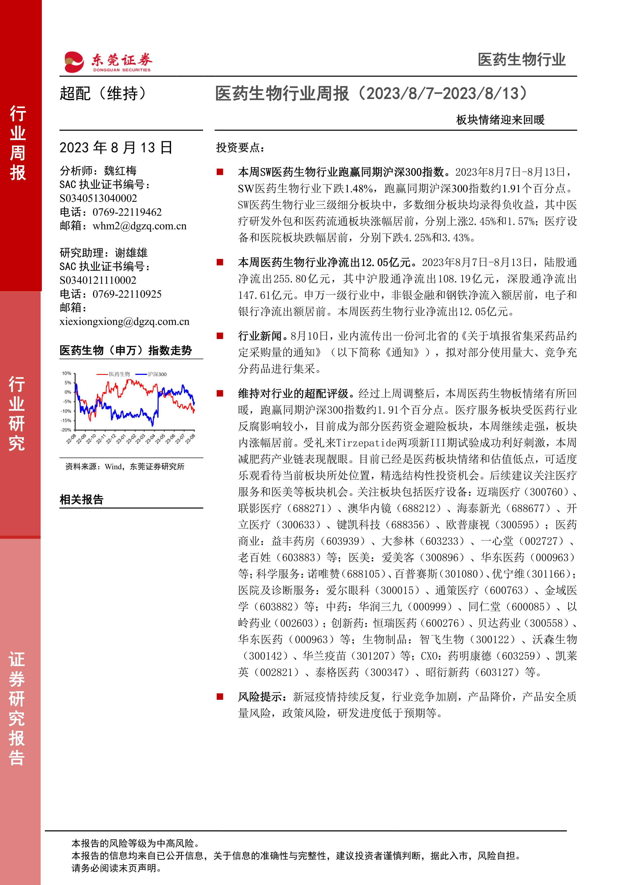 本报告对2023年8月7日至13日医药生物行业进行了周度回顾和分析。报告指出,尽管行业整体下跌,但跑赢大盘,且估值处于历史低位,行业情绪有所回暖。报告建议投资者关注医疗服务和医美等板块的结构性投资机会,并列举了多个值得关注的上市公司,同时提醒投资者注意多种潜在的风险因素。 报告数据主要来自Wind和东莞证券研究所,投资者需谨慎判断,风险自担。