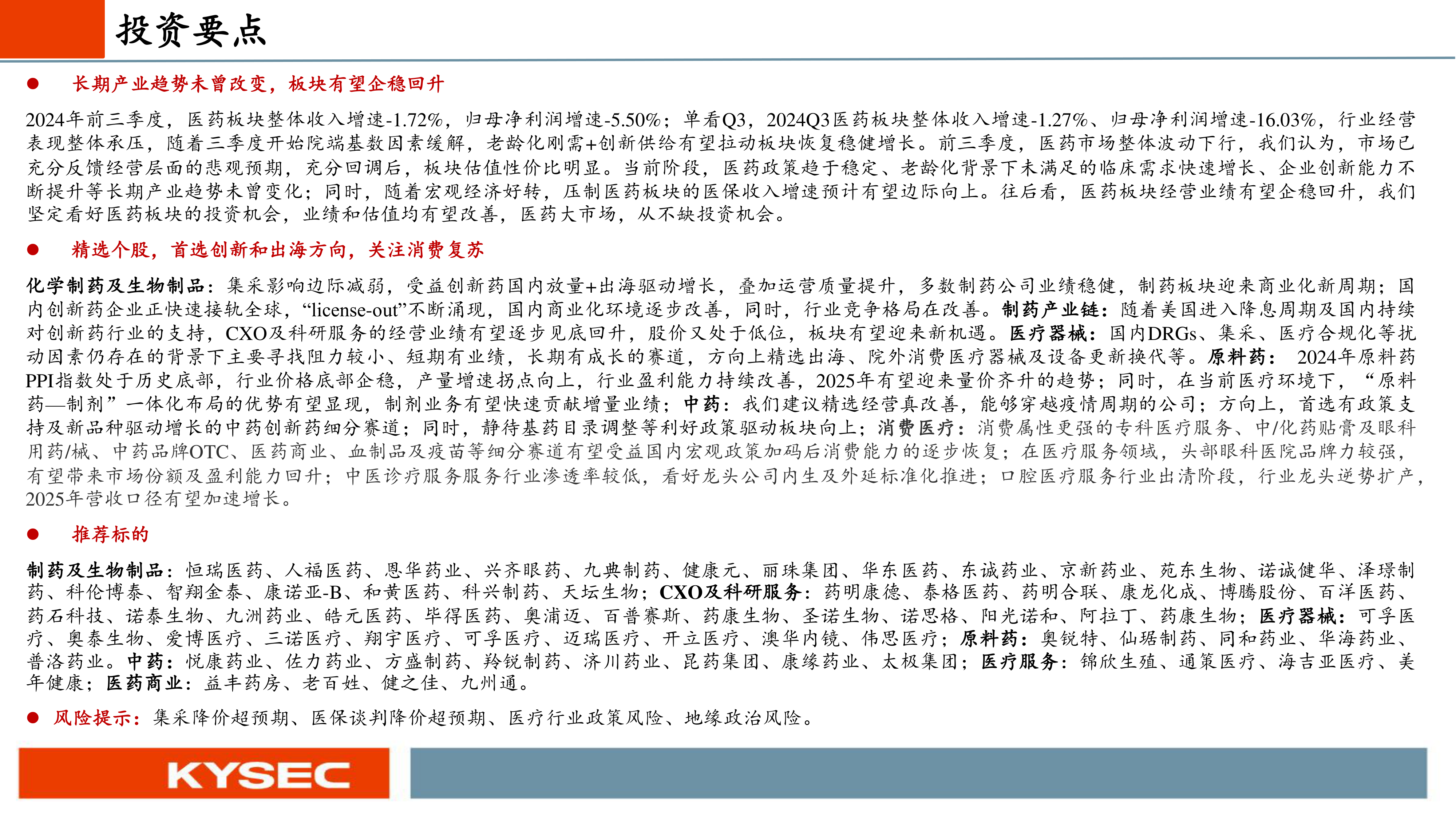 化学制药及生物制品:集采影响边际减弱,受益创新药国内放量+出海驱动增长,叠加运营质量提升,多数制药公司业绩稳健,制药板块迎来商业化新周期;国内创新药企业正快速接轨全球,“license-out”不断涌现,国内商业化环境逐步改善,同时,行业竞争格局在改善。制药产业链:随着美国进入降息周期及国内持续对创新药行业的支持,CXO及科研服务的经营业绩有望逐步见底回升,股价又处于低位,板块有望迎来新机遇。医疗器械:国内DRGs、集采、医疗合规化等扰动因素仍存在的背景下主要寻找阻力较小、短期有业绩,长期有成长的赛道,方向上精选出海、院外消费医疗器械及设备更新换代等。原料药:2024年原料药PPI指数处于历史底部,行业价格底部企稳,产量增速拐点向上,行业盈利能力持续改善,2025年有望迎来量价齐升的趋势;同时,在当前医疗环境下,“原料药—制剂”一体化布局的优势有望显现,制剂业务有望快速贡献增量业绩;中药:我们建议精选经营真改善,能够穿越疫情周期的公司;方向上,首选有政策支持及新品种驱动增长的中药创新药细分赛道;同时,静待基药目录调整等利好政策驱动板块向上;消费医疗:消费属性更强的专科医疗服务、中/化药贴膏及眼科用药/械、中药品牌OTC、医药商业、血制品及疫苗等细分赛道有望受益国内宏观政策加码后消费能力的逐步恢复;在医疗服务领域,头部眼科医院品牌力较强,有望带来市场份额及盈利能力回升;中医诊疗服务服务行业渗透率较低,看好龙头公司内生及外延标准化推进;口腔医疗服务行业出清阶段,行业龙头逆势扩产,2025年营收口径有望加速增长。