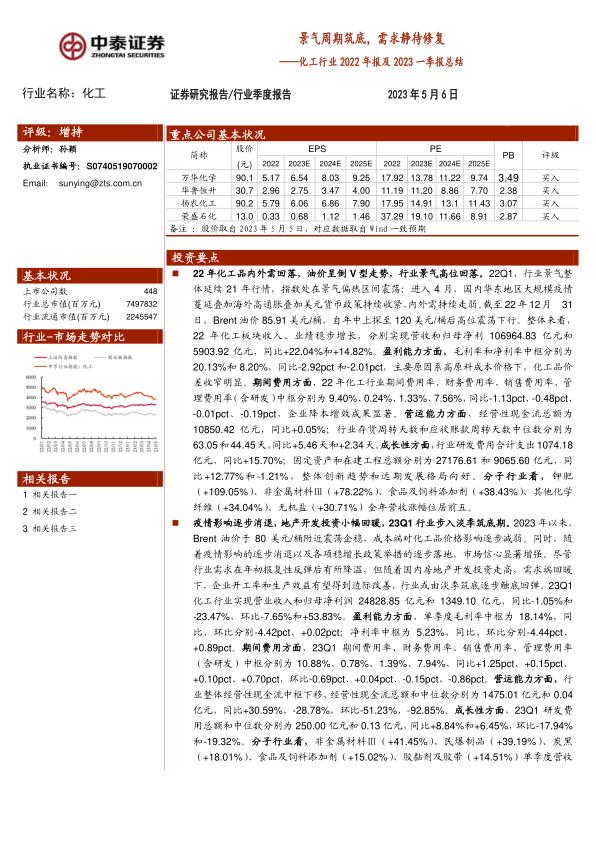 本报告从大化工、基础化工和石油石化三个层面,对2022年年报和2023年一季报数据进行了深入分析,并提出了相应的投资建议。