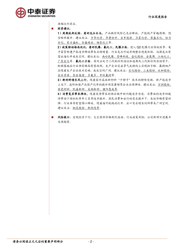 报告最后给出了具体的投资建议,将投资标的分为四大类:周期底部反转的龙头白马股、政策驱动格局优化的民爆和氟化工行业、受益于国内高端新材料技术突破的新材料行业以及消费复苏带来的弹性行业。同时,报告也指出了宏观经济下行、大宗原料价格剧烈波动、行业政策风险以及公司新项目进展不及预期等潜在风险。