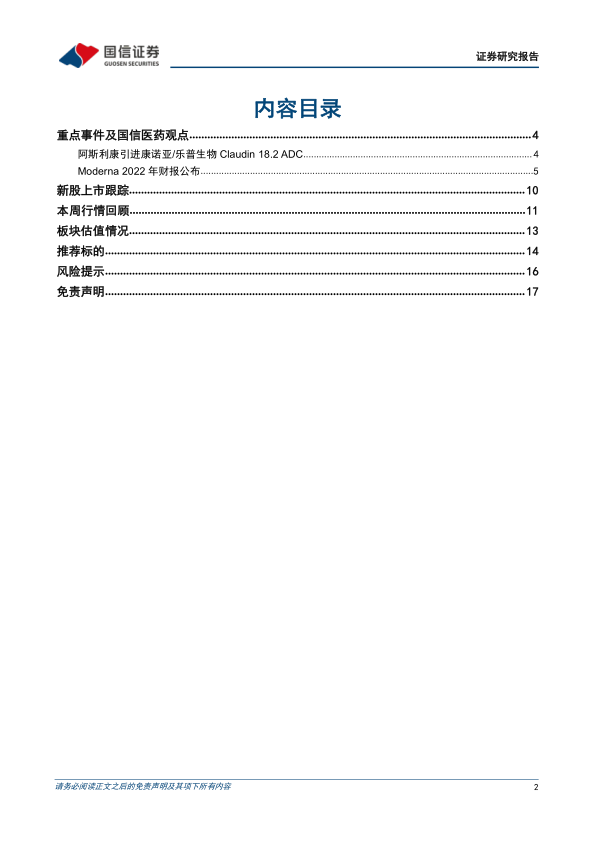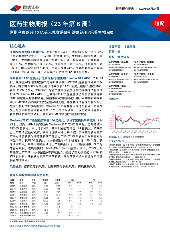 本报告分析了2023年2月20日至24日医药生物板块的市场表现,重点关注了康诺亚/乐普生物与阿斯利康的ADC药物授权交易以及Moderna的2022年财报。报告指出,医药板块整体表现弱于大盘,但部分细分板块估值较高,部分公司拥有丰富的研发管线,未来增长潜力较大。报告最后推荐了多个具有投资价值的医药公司。 需要注意的是,投资存在风险,投资者应谨慎决策。