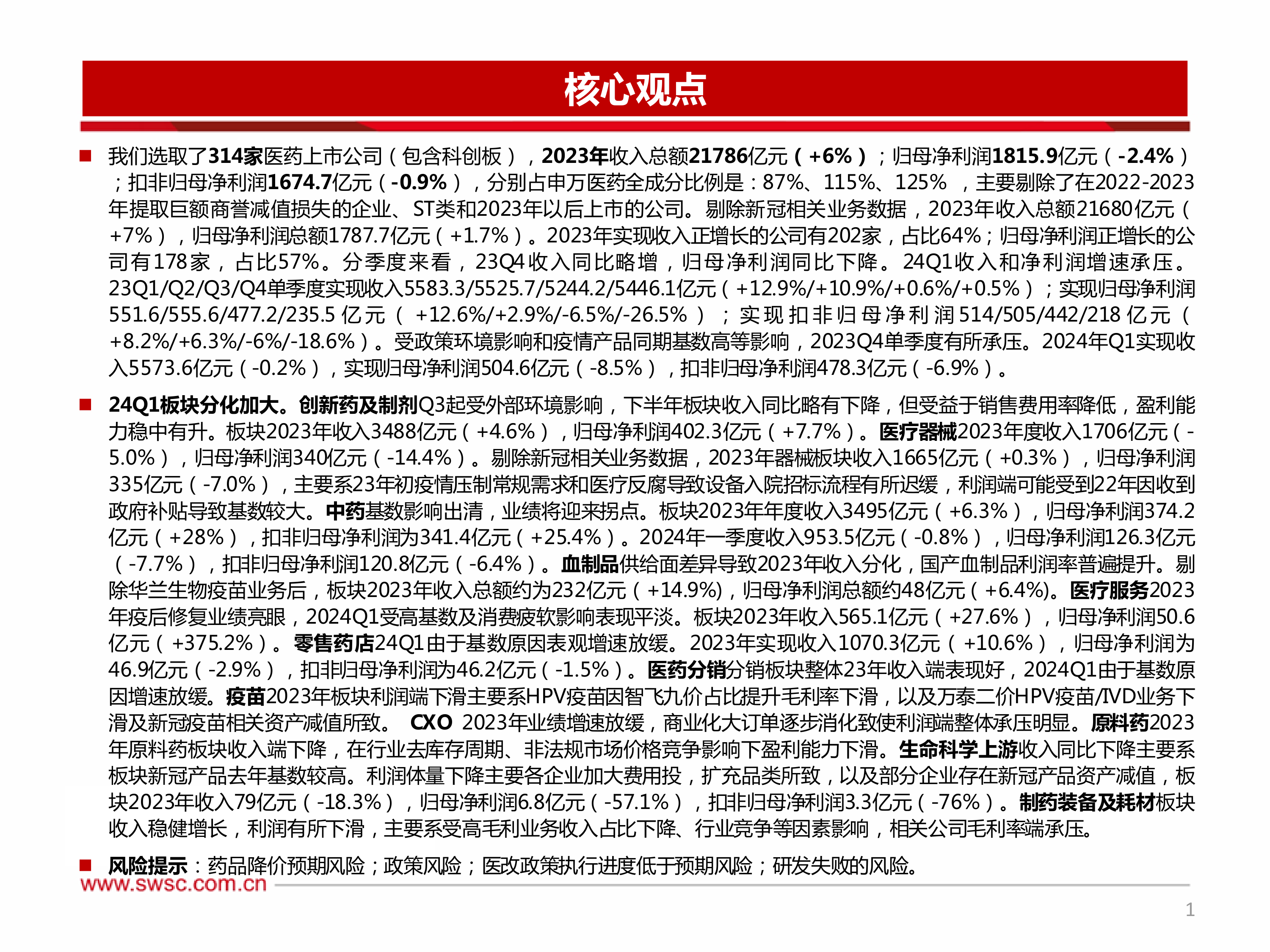 本报告基于西南证券研究发展中心对314家医药上市公司(包含科创板)2023年年报及2024年一季报的统计分析,核心观点如下: