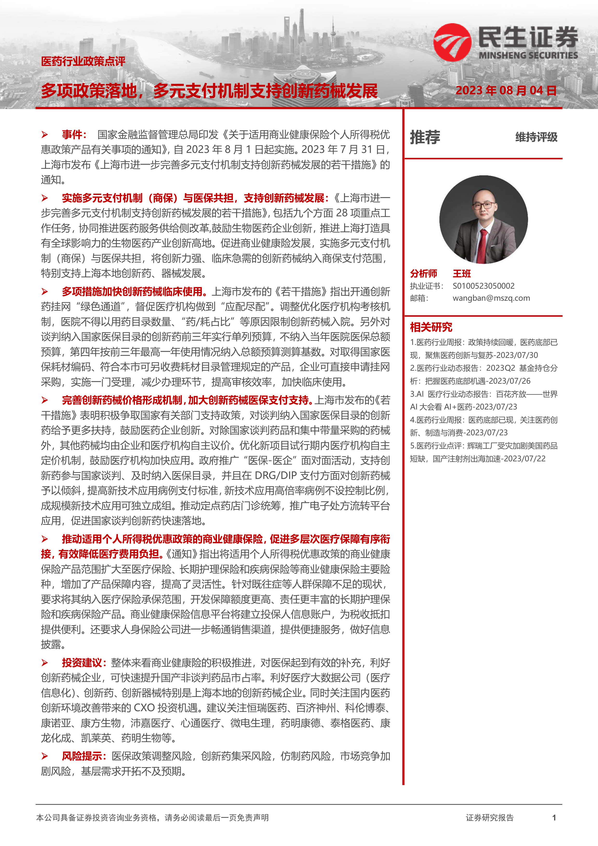 推动适用个人所得税优惠政策的商业健康保险,促进多层次医疗保障有序衔接,有效降低医疗费用负担。《通知》指出将适用个人所得税优惠政策的商业健康保险产品范围扩大至医疗保险、长期护理保险和疾病保险等商业健康保险主要险种,增加了产品保障内容,提高了灵活性。针对既往症等人群保障不足的现状,要求将其纳入医疗保险承保范围,开发保障额度更高、责任更丰富的长期护理保险和疾病保险产品。商业健康保险信息平台将建立投保人信息账户,为税收抵扣提供便利。还要求人身保险公司进一步畅通销售渠道,提供便捷服务,做好信息披露。?投资建议:整体来看商业健康险的积极推进,对医保起到有效的补充,利好创新药械企业,可快速提升国产非谈判药品市占率。利好医疗大数据公司(医疗信息化)、创新药、创新器械特别是上海本地的创新药械企业。同时关注国内医药创新环境改善带来的CXO投资机遇。建议关注恒瑞医药、百济神州、科伦博泰、康诺亚、康方生物,沛嘉医疗、心通医疗、微电生理,药明康德、泰格医药、康龙化成、凯莱英、药明生物等。?风险提示:医保政策调整风险,创新药集采风险,仿制药风险,市场竞争加剧风险,基层需求开拓不及预期。