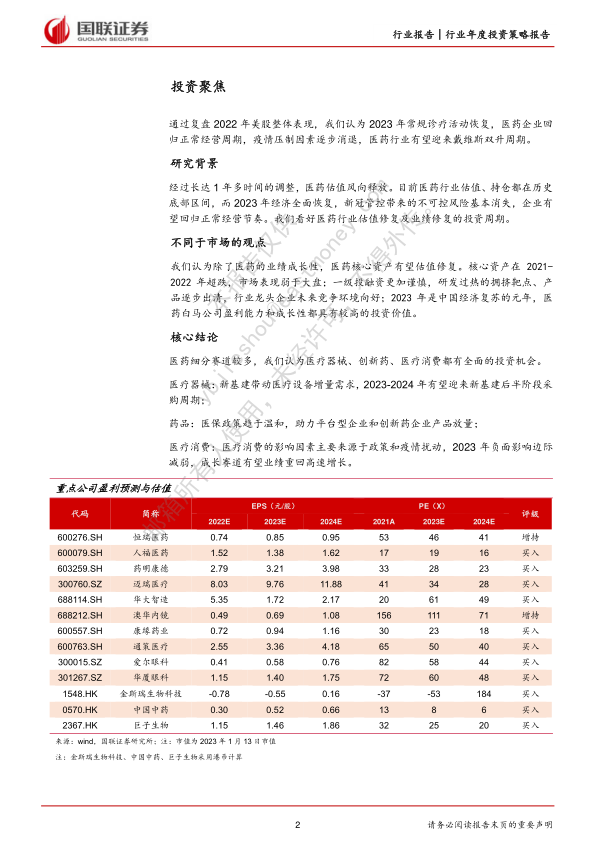 本报告的核心观点是:2023年医药行业有望迎来复苏周期,投资主线将回归内在价值。基于对2022年美股医药行业表现的复盘分析,以及对中国经济复苏的预期,我们认为医药核心资产有望价值重估,并看好医疗器械、创新药和医疗消费等细分赛道的投资机会。报告重点推荐了14只股票(10只A股和4只H股),并对这些股票的盈利预测和估值进行了详细分析。