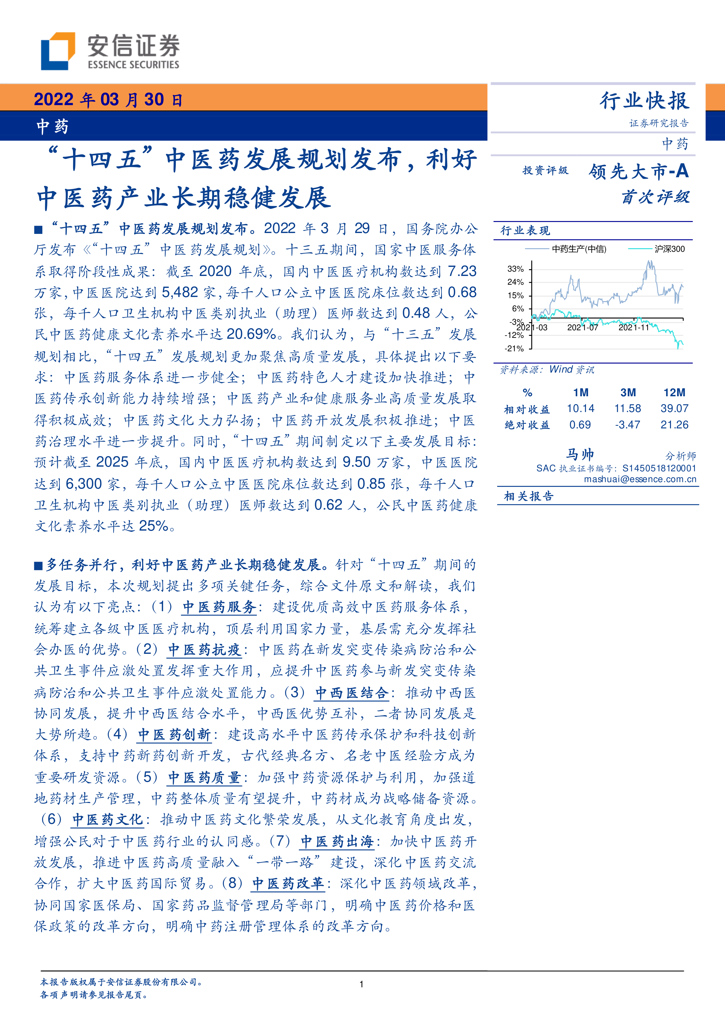 本报告的核心观点是:国务院办公厅发布的《“十四五”中医药发展规划》为中医药产业长期稳健发展提供了强有力的政策支持。该规划提出多项关键任务,涵盖中医药服务体系建设、应急能力提升、中西医结合发展、传承创新、产业高质量发展、文化繁荣发展、开放发展以及深化改革等多个方面,为中医药产业未来发展指明了方向。 报告建议关注中药饮片及中药配方颗粒、中药创新药、中药OTC、中医医疗服务等细分板块的投资机会,但也提示了中药材价格波动、行业政策不确定性和新冠疫情等风险因素。