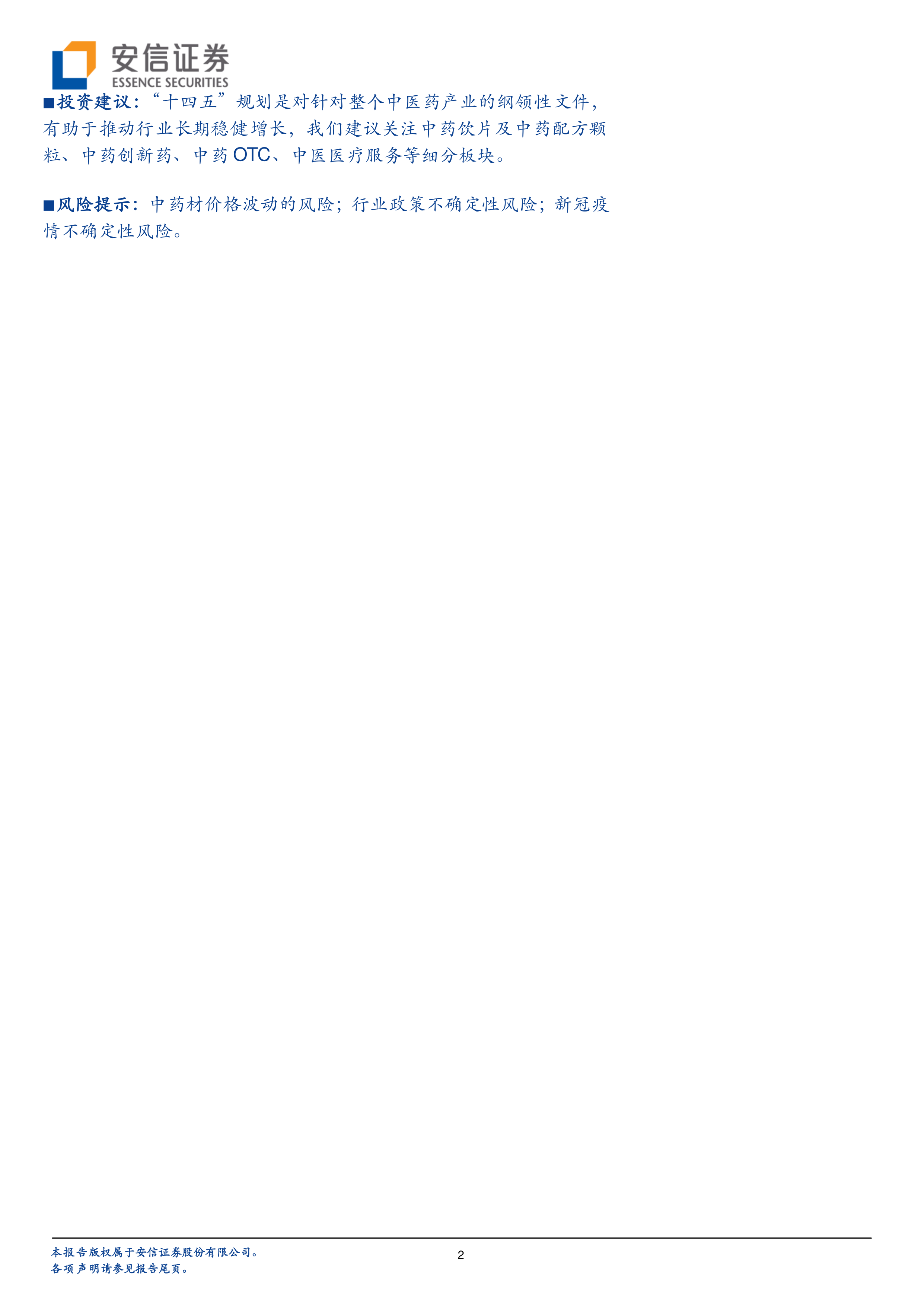 投资建议:“十四五”规划是对针对整个中医药产业的纲领性文件,有助于推动行业长期稳健增长,我们建议关注中药饮片及中药配方颗粒、中药创新药、中药OTC、中医医疗服务等细分板块。