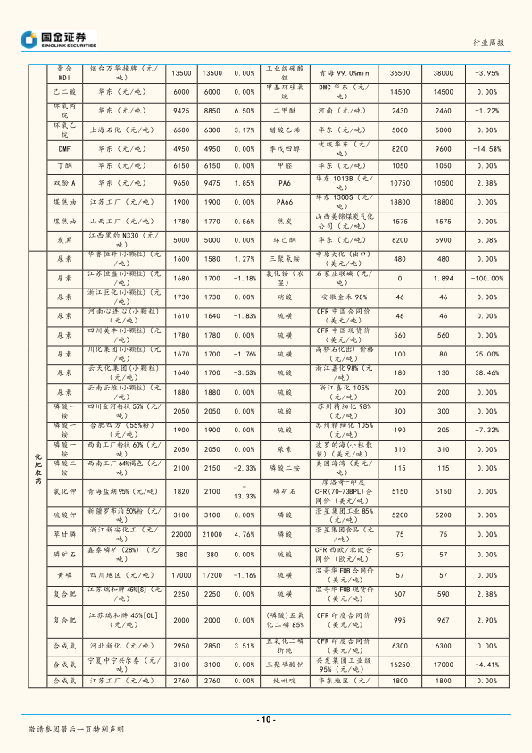 报告详细分析了化肥、煤化工、农药、维生素、氨基酸和聚氨酯等子行业的近期情况。
