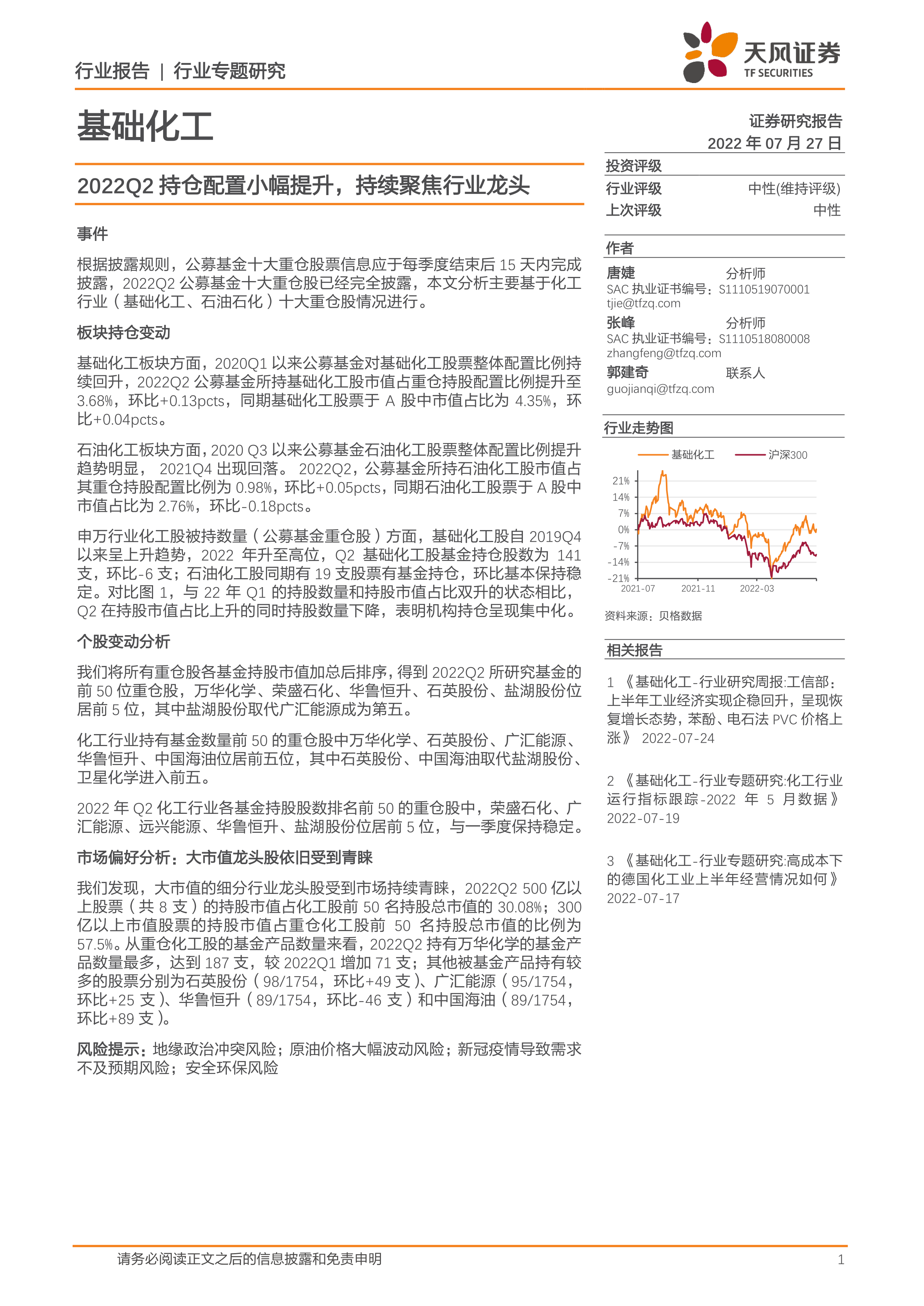 本报告通过对2022年Q2公募基金重仓化工股数据的分析,揭示了基础化工行业持续受到机构投资者青睐,且投资呈现集中化趋势,大市值龙头企业地位稳固的市场特征。 基础化工板块的持仓市值占比持续提升,而石油化工板块则相对稳定。 市场资金更倾向于配置大市值、业绩优良的龙头企业,这反映了化工行业集中度提升的趋势,也为投资者提供了重要的参考信息。 然而,报告也提示了地缘政治冲突、原油价格波动、疫情以及安全环保等风险因素,投资者需谨慎决策。