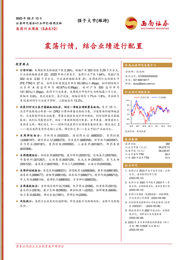本报告对2023年5月8日至12日医药行业周市场表现进行了全面分析。 短期来看,医药行业整体表现弱于大盘,但长期来看,创新、疫后复苏和自主可控仍是核心投资主线。 北京市医保局发布的DRG付费和带量采购方案利好创新医疗器械板块。 报告建议投资者结合一季报业绩预期,合理配置医药行业各板块,并关注创新医疗器械板块的投资机会。 报告还提供了详细的市场数据、政策解读和个股分析,为投资者提供了全面的行业信息和投资参考。