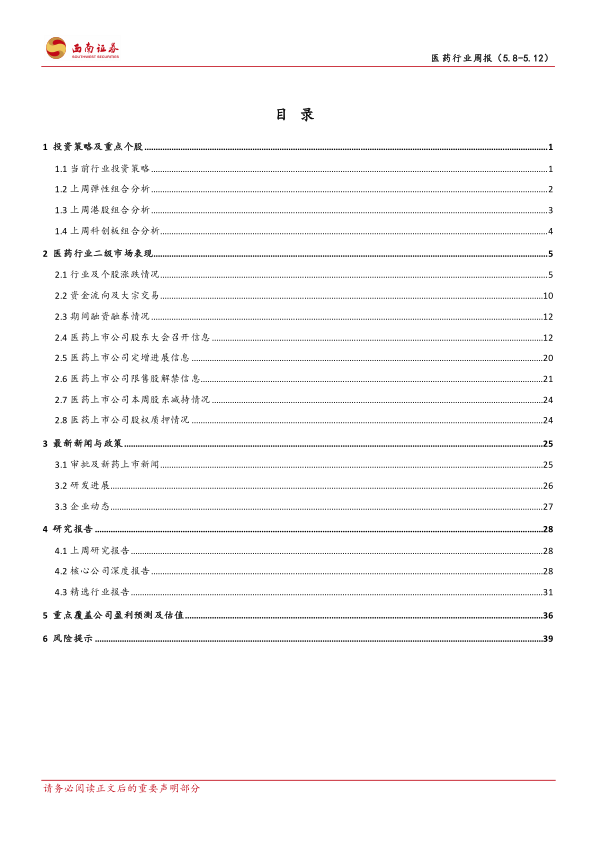 风险提示:医药行业政策风险超预期;研发进展不及预期风险;业绩不及预期风险。