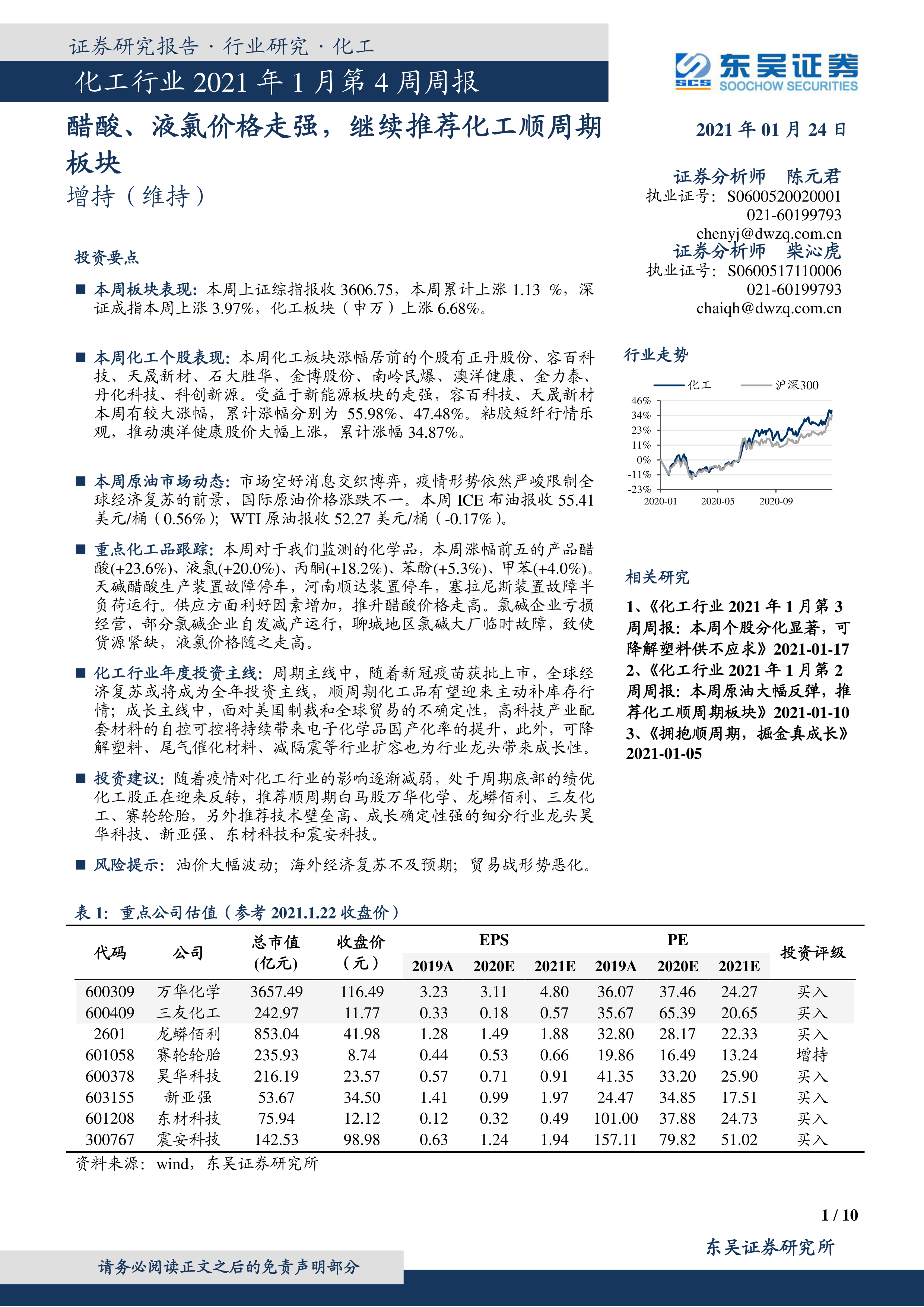 化工行业2021年1月第4周周报:醋酸、液氯价格走强,继续推荐化工顺周期板块