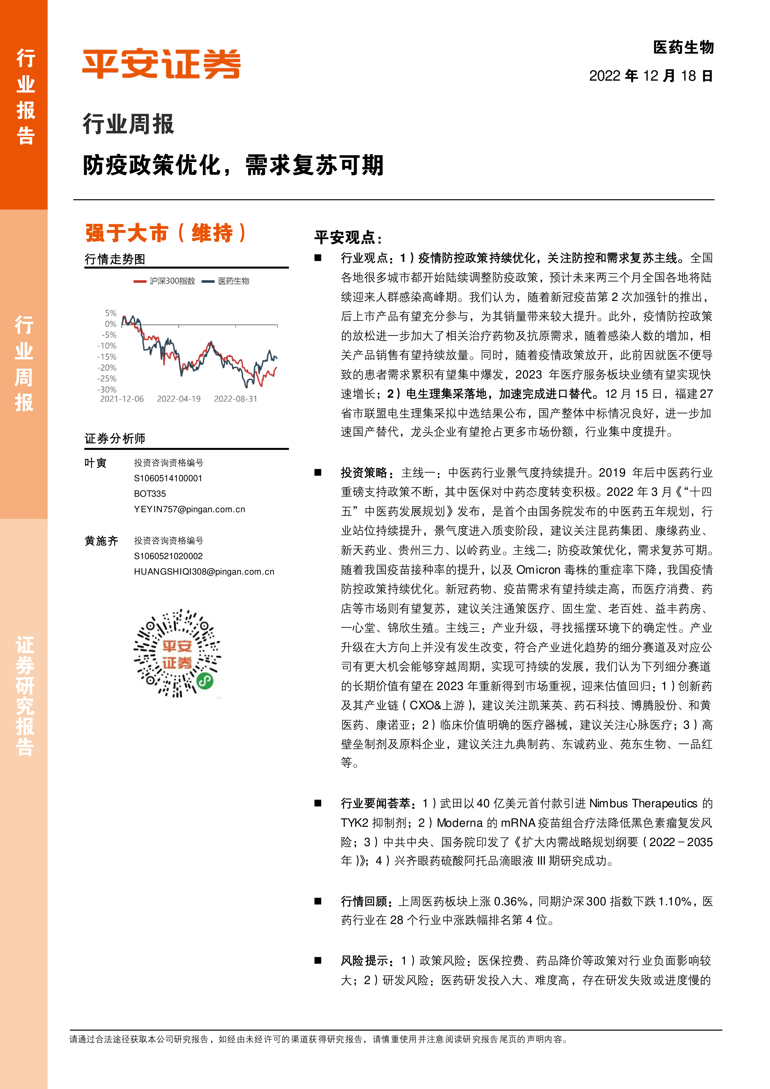 本报告的核心观点是:随着中国防疫政策的优化,医药行业面临需求复苏的机遇,但同时也面临政策风险、研发风险和公司经营风险。报告建议关注三个投资主线:中医药行业景气度提升、防疫政策优化下的需求复苏以及产业升级带来的确定性机会。报告还对部分个股进行了分析,并总结了近期医药行业的重要新闻事件和市场表现。
