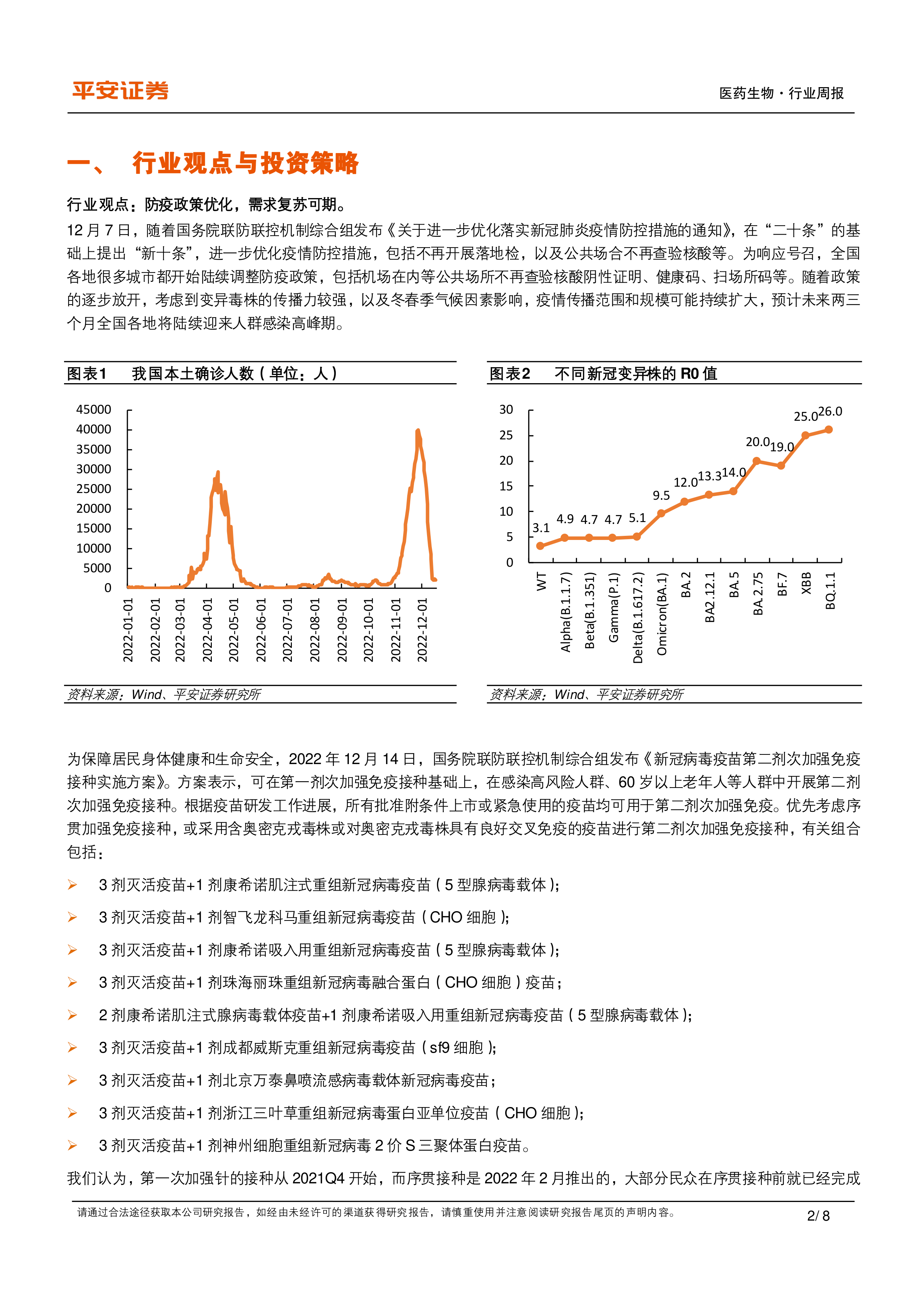 报告分析了中国防疫政策优化对医药行业的影响。随着政策的放开,未来两三个月全国各地将陆续迎来人群感染高峰期,这将导致新冠药物、疫苗以及抗原的需求持续增长。同时,此前因就医不便积压的医疗服务需求也将集中释放,医疗服务板块业绩有望在2023年实现快速增长。 报告特别提到新冠疫苗第二剂次加强免疫接种方案的推出,为后上市疫苗产品提供了市场机会。