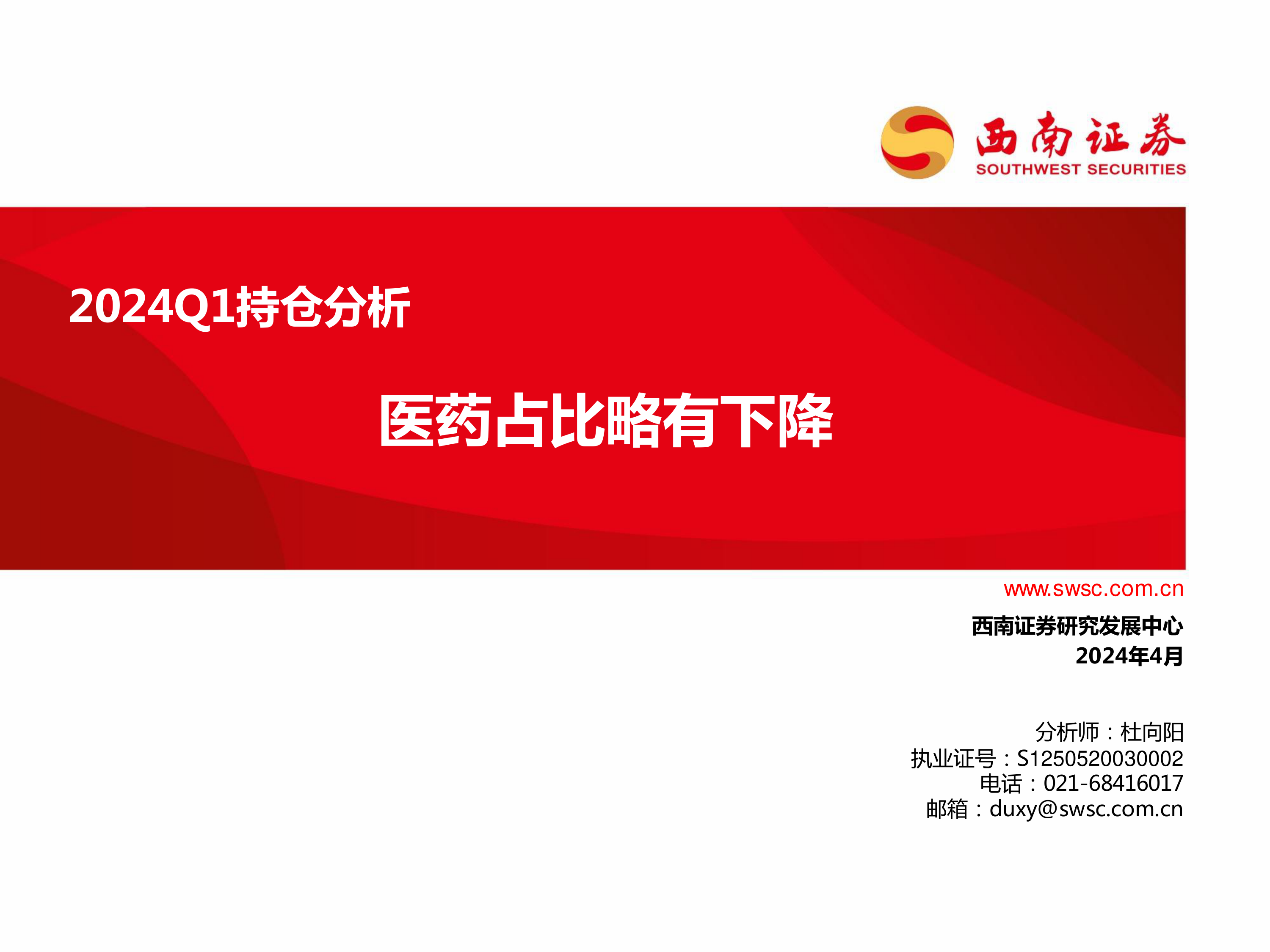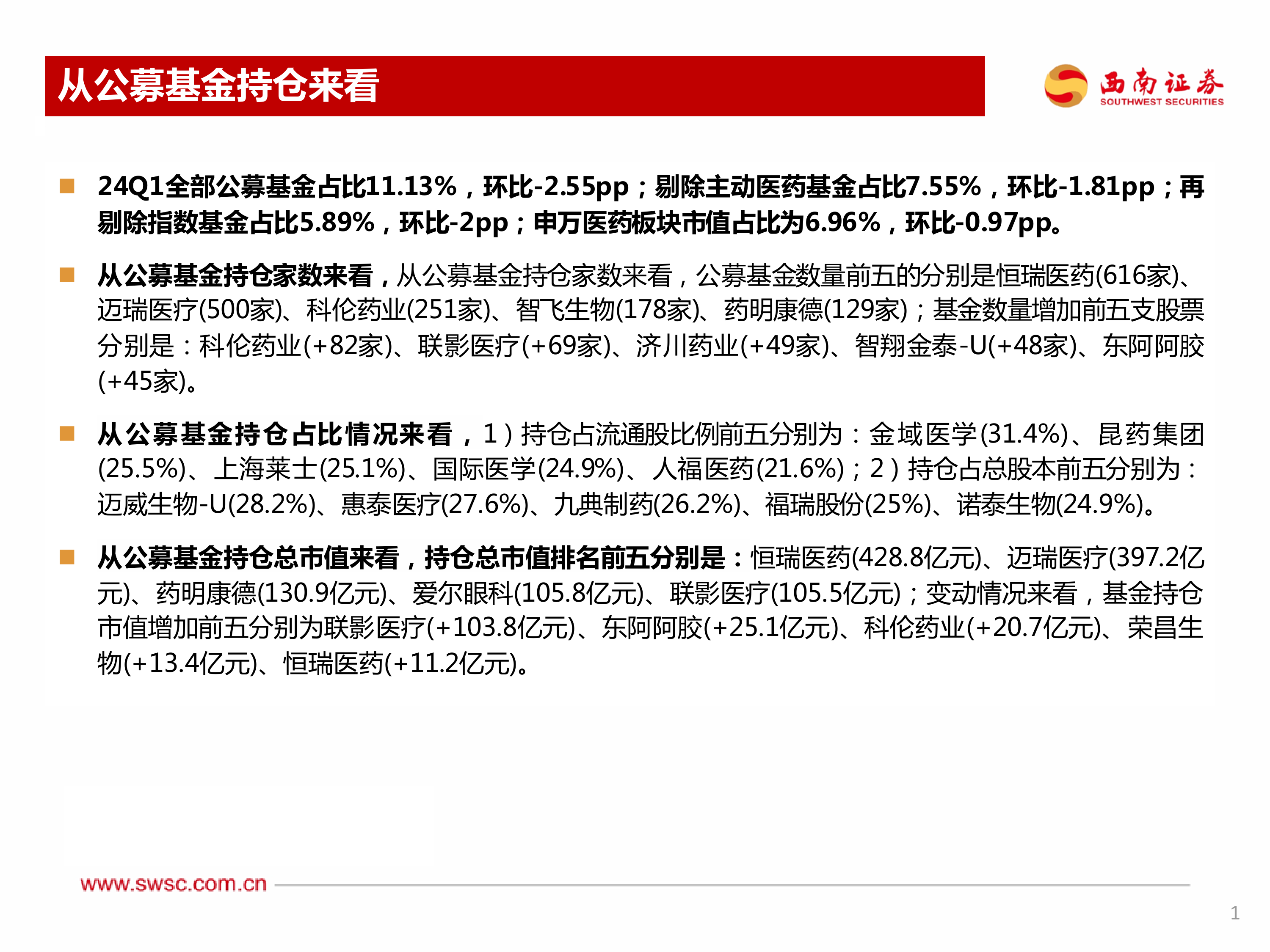 本报告主要从公募基金持仓和陆股通持仓两个方面,对2024Q1医药板块的市场表现进行分析。