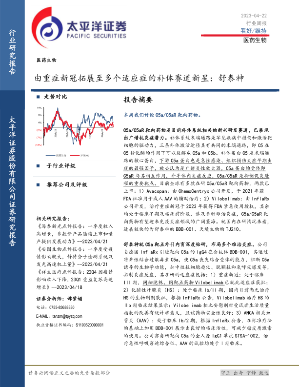 本报告对补体系统C5a/C5aR靶向药物市场、舒泰神公司在该领域的布局以及医药行业整体的投资前景进行了深入分析。报告指出C5a/C5aR靶向药物市场潜力巨大,舒泰神公司在该领域具有领先优势,医药板块短期震荡,长期向好。报告还对多家医药公司进行了详细研究,并提供了相应的投资建议,为投资者提供了有价值的参考信息。 然而,报告也提示了诸多风险,例如政策风险、价格风险、研发风险等,投资者需谨慎评估风险后再进行投资决策。