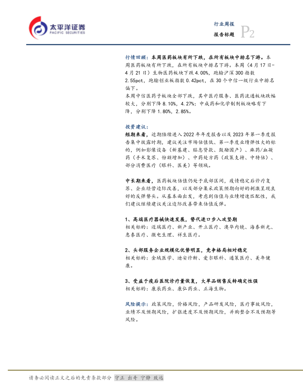中长期来看,医药板块估值仍处于底部区间,疫情稳定后诊疗复苏、企业经营边际改善,以及部分集采政策预期向好的刺激呈现良好的反弹势头。从基本面出发,考虑到估值与业绩增速匹配性,我们建议继续建议关注边际改善带来估值反弹。