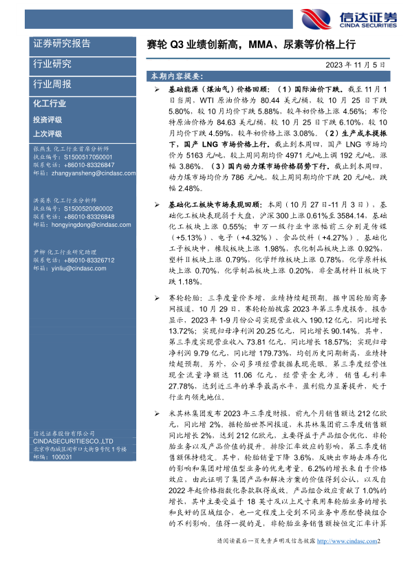 化工行业周报:赛轮Q3业绩创新高,MMA、尿素等价格上行