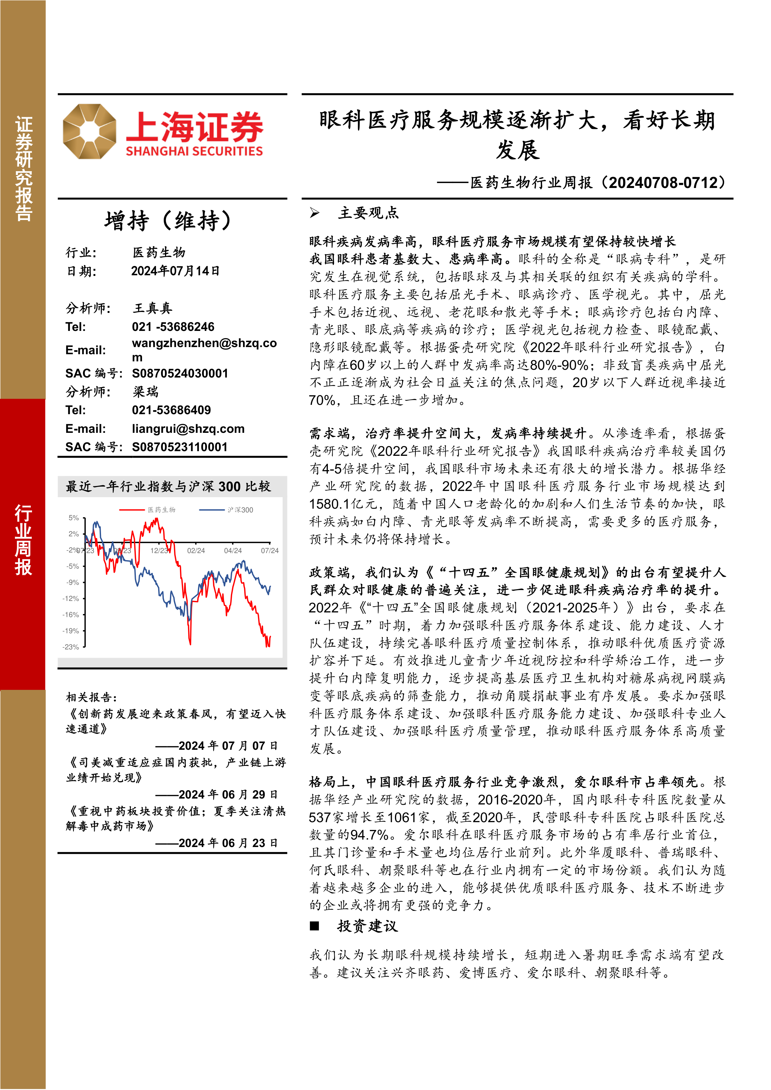 医药生物行业周报:眼科医疗服务规模逐渐扩大,看好长期发展