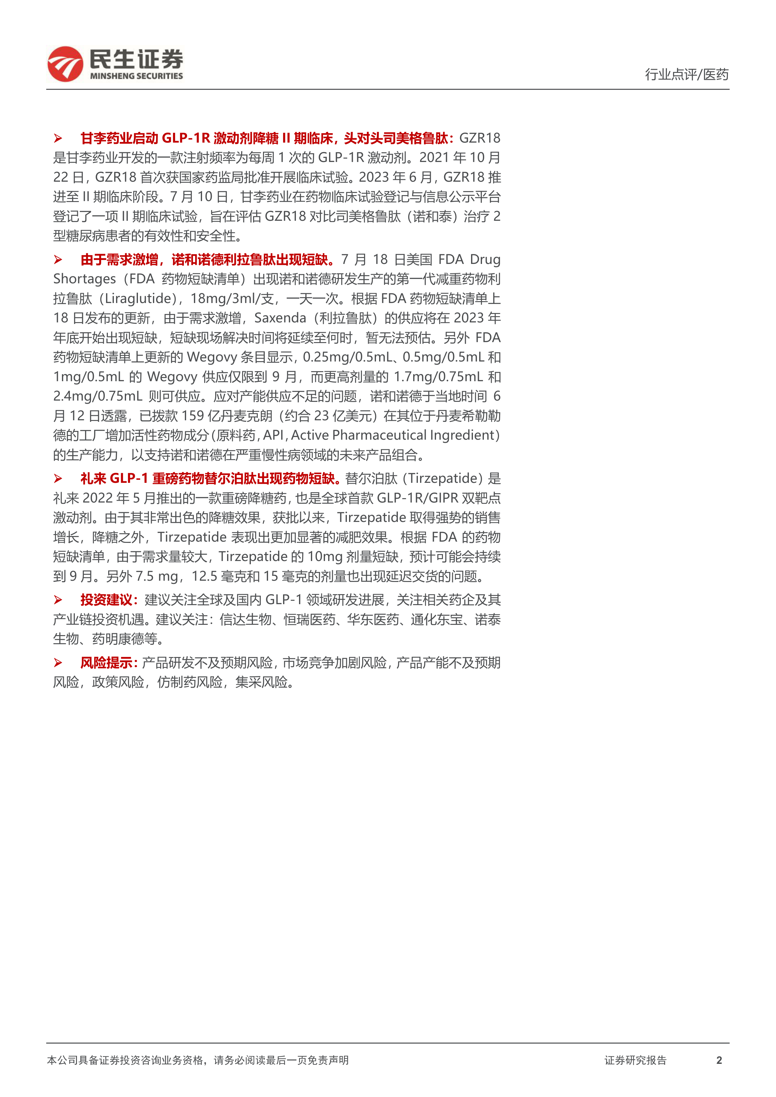 报告最后给出了投资建议,建议关注全球及国内GLP-1领域研发进展,并关注相关药企及其产业链投资机遇,同时列举了信达生物、恒瑞医药、华东医药、通化东宝、诺泰生物、药明康德等公司。 报告也明确指出了产品研发不及预期风险、市场竞争加剧风险、产品产能不及预期风险、政策风险、仿制药风险、集采风险等潜在风险。