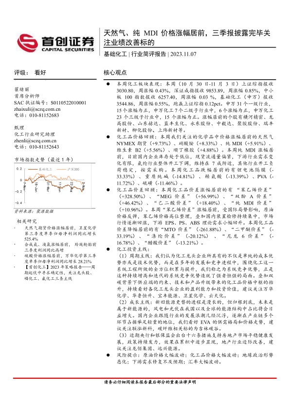 基础化工行业简评报告:天然气、纯MDI价格涨幅居前,三季报披露完毕关注业绩改善标的