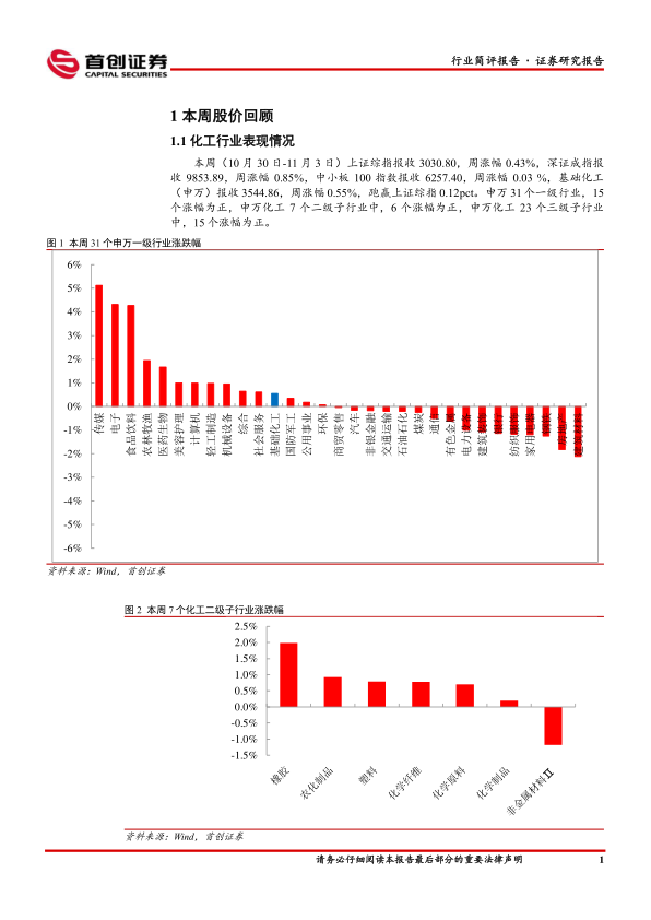 本周化工板块表现: 本周(10 月 30 日-11 月 3 日)上证综指报收3030.80,周涨幅 0.43%,深证成指报收 9853.89,周涨幅 0.85%,中小板 100 指数报收 6257.40,周涨幅 0.03 %,基础化工(申万)报收3544.86,周涨幅 0.55%,跑赢上证综指 0.12pct。申万 31 个一级行业,15个涨幅为正,申万化工 7个二级子行业中,6个涨幅为正,申万化工23 个三级子行业中,15 个涨幅为正。涨幅居前的个股有横河精密、龙高股份、山东赫达、蓝丰生化、永东股份、中毅达、聚胶股份、瑞丰新材、柳化股份、上纬新材等。