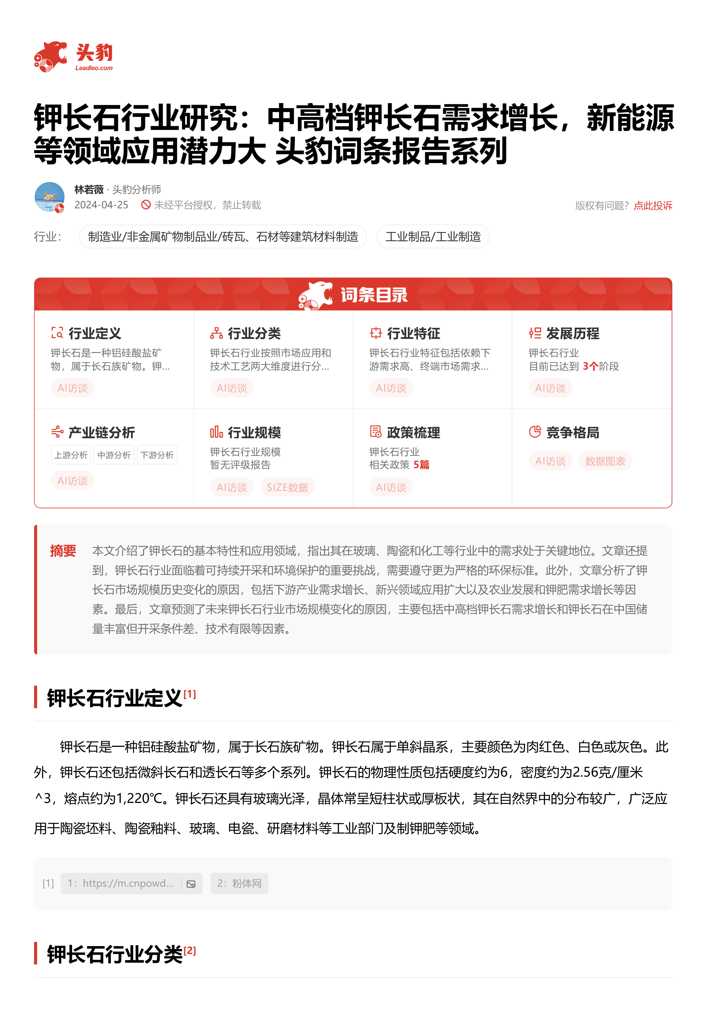 钾长石行业研究:中高档钾长石需求增长,新能源等领域应用潜力大 头豹词条报告系列