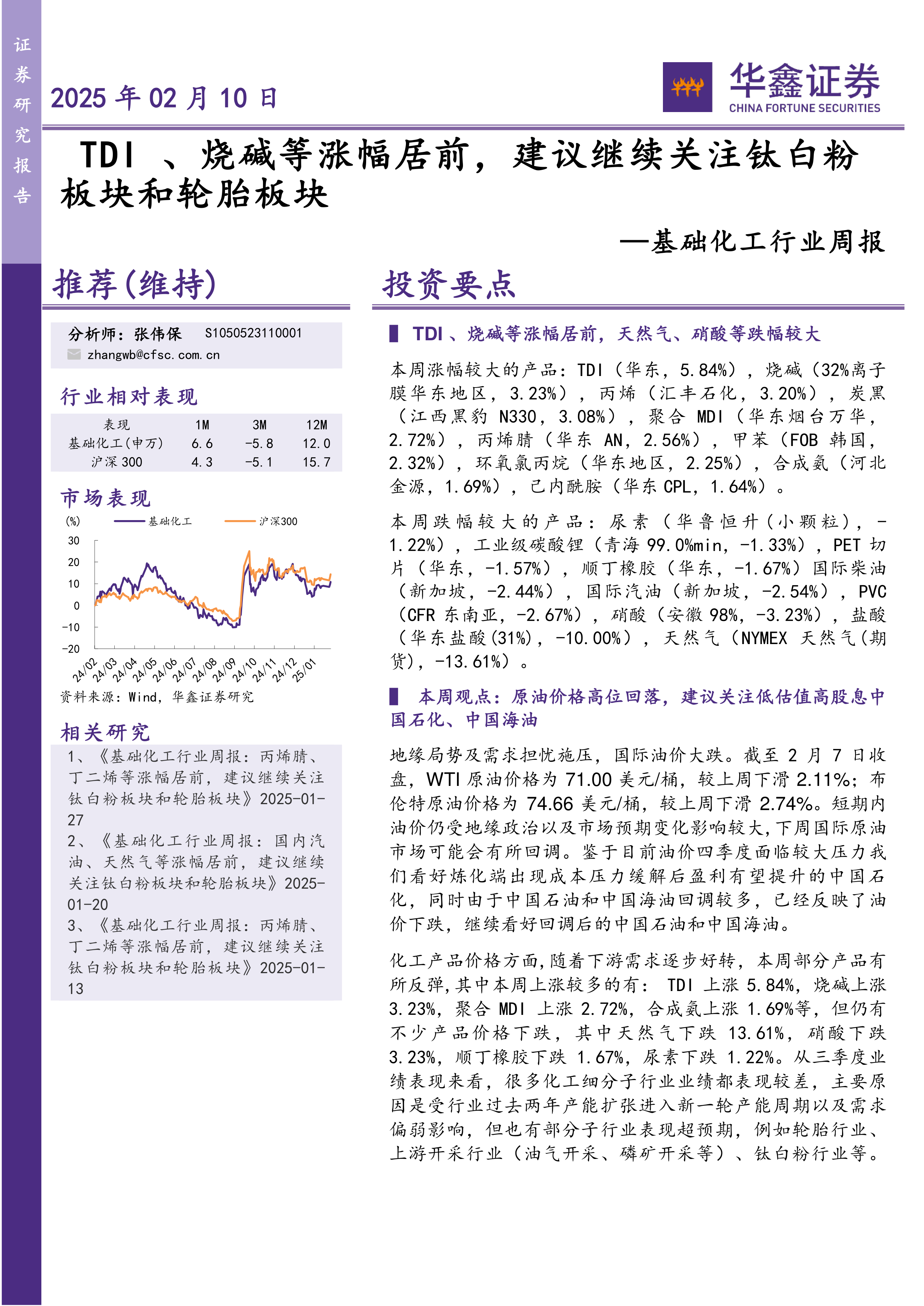 基础化工行业周报:TDI、烧碱等涨幅居前,建议继续关注钛白粉板块和轮胎板块