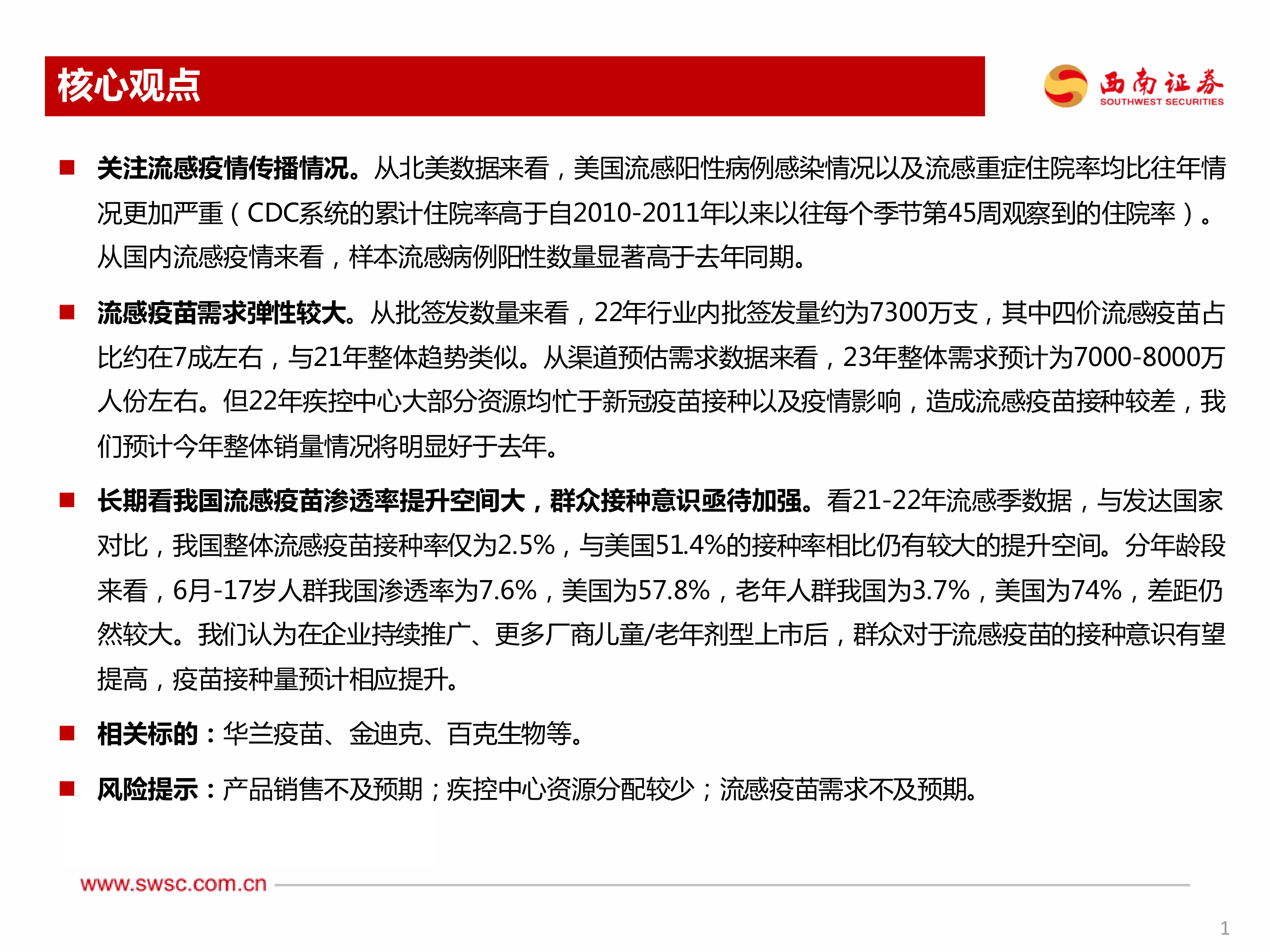风险提示:产品销售不及预期;疾控中心资源分配较少;流感疫苗需求不及预期。