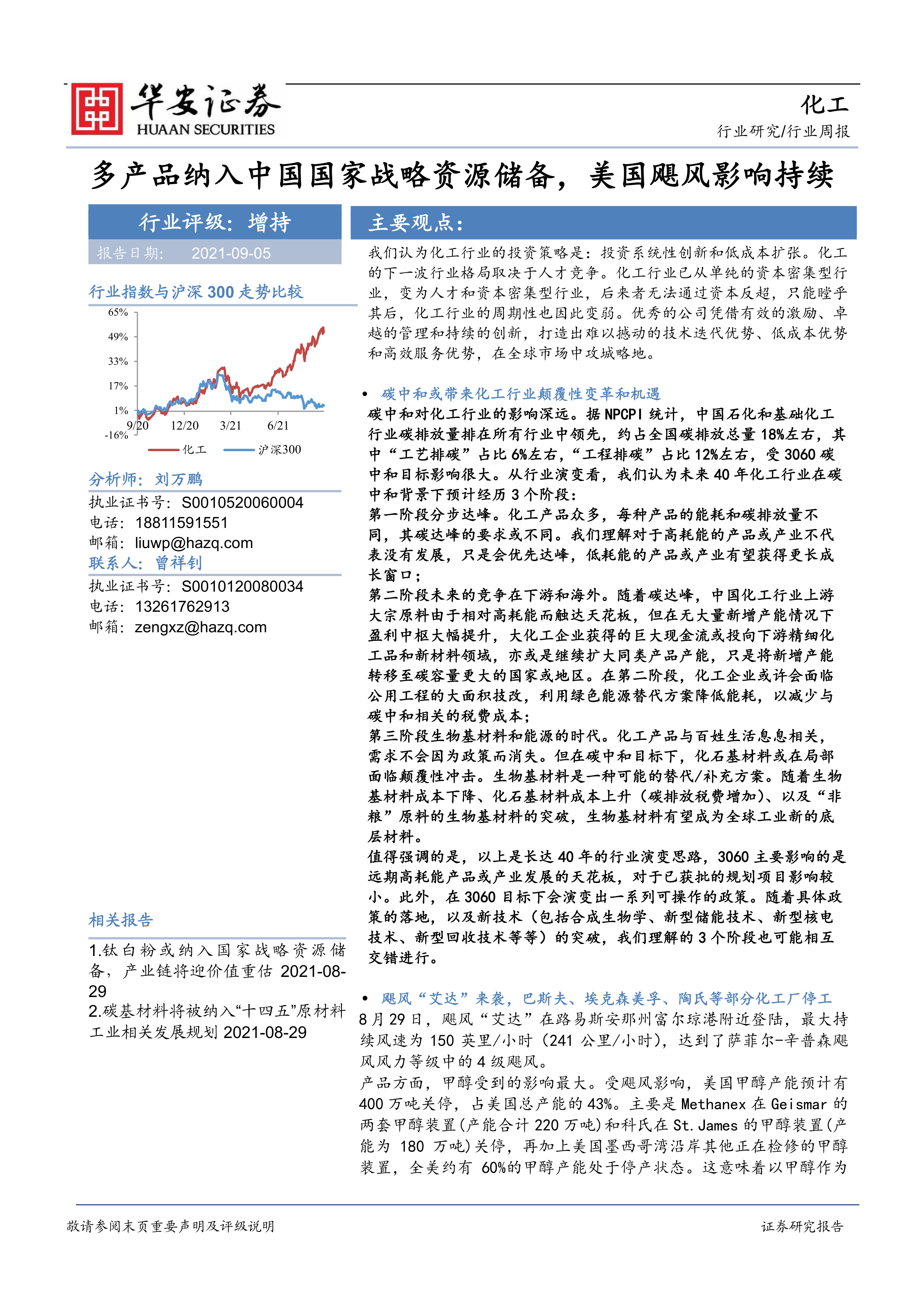 化工行业周报:多产品纳入中国国家战略资源储备,美国飓风影响持续