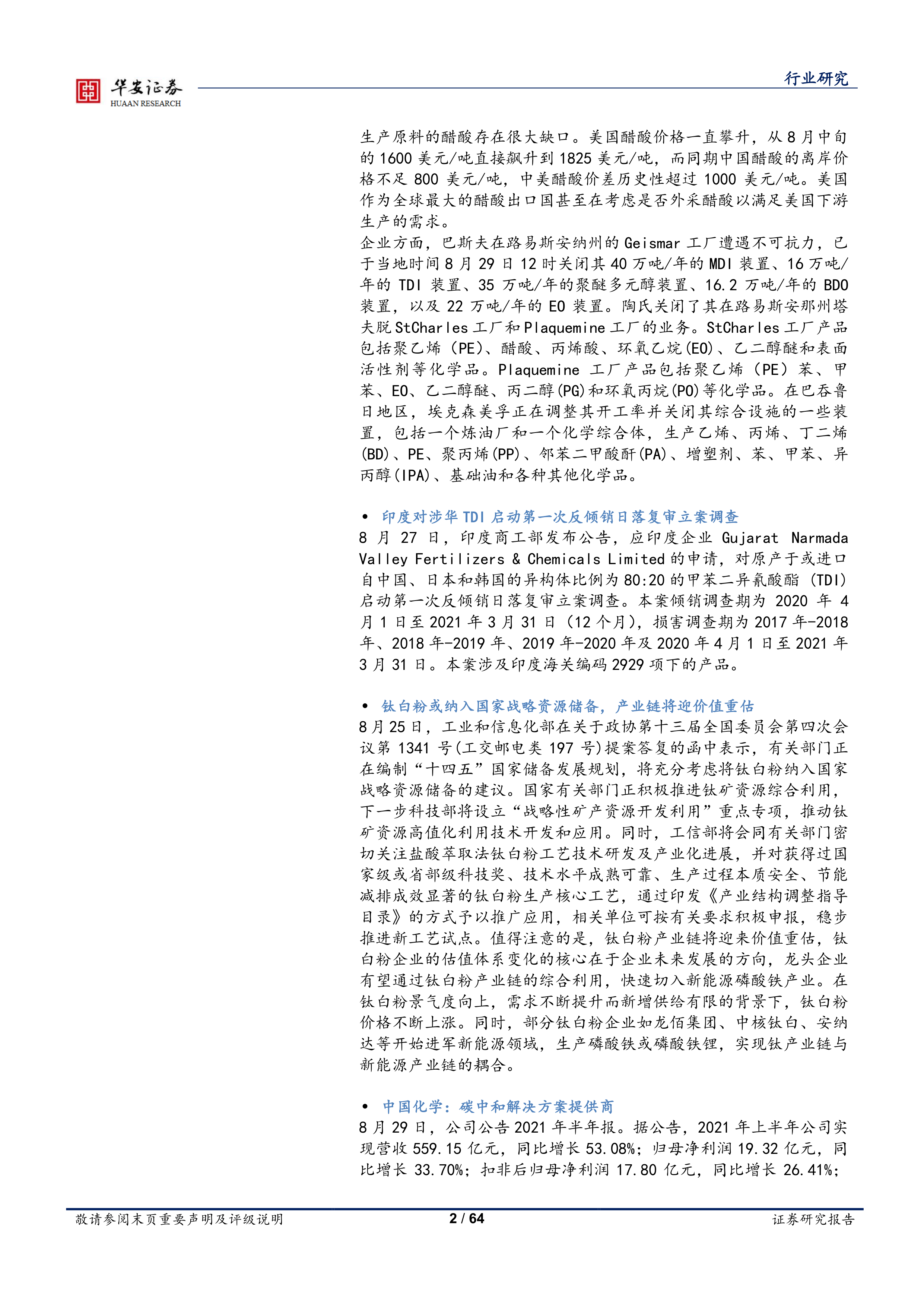 报告对主要化工产品的检修和不可抗力情况进行了统计,涵盖纯苯、甲苯、丙烯、丁二烯、乙二醇、醋酸、MDI、TDI、PTA等多种产品,并按公司、地址、时间等维度进行了详细列示,反映了行业供给侧的短期波动。美国飓风“艾达”对美国甲醇和部分化工厂的影响被重点提及,并分析了其对醋酸价格的影响。印度对涉华TDI的反倾销调查也被纳入其中。