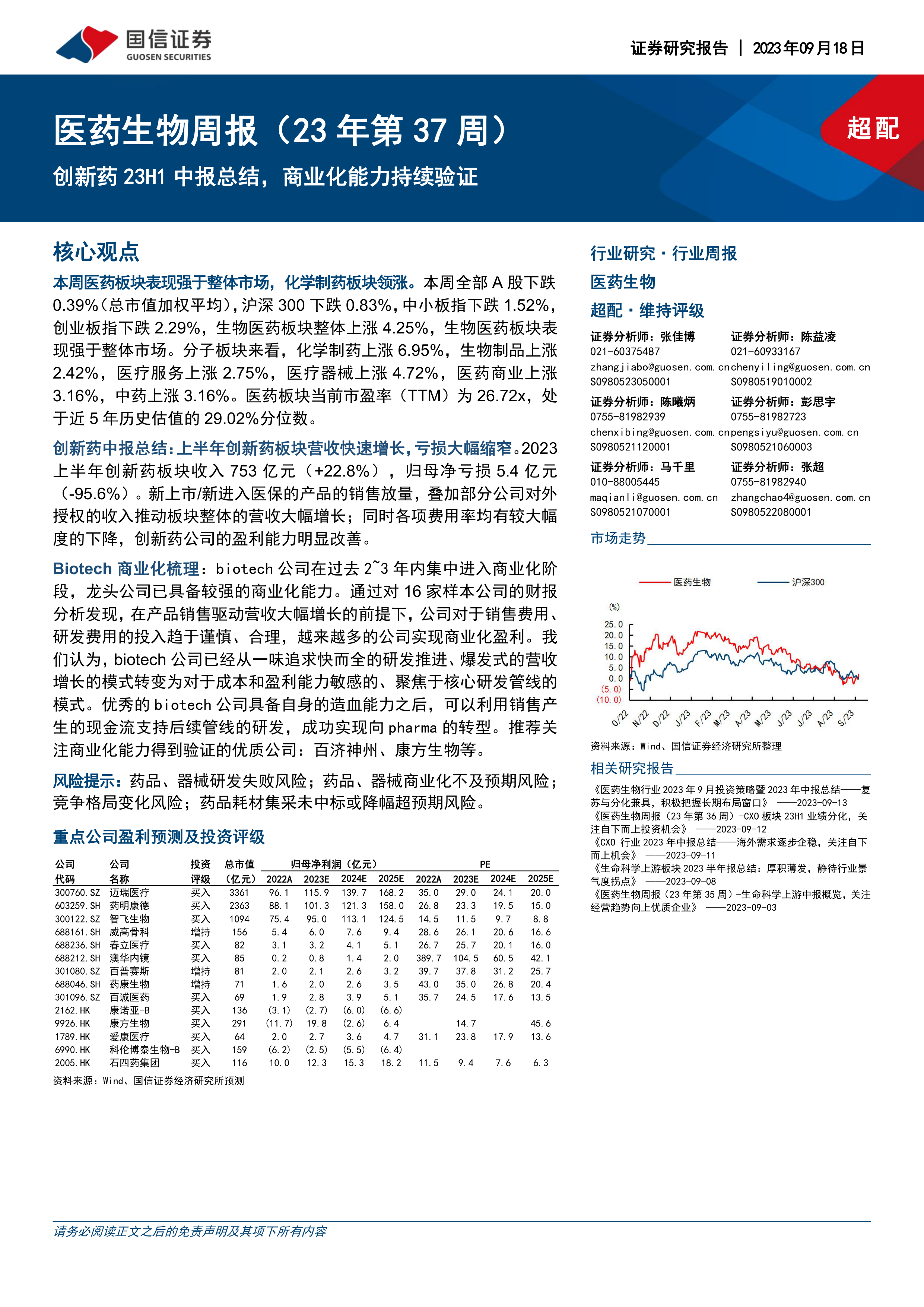 本报告对2023年第37周医药生物板块的市场表现、创新药中报业绩、Biotech公司商业化情况进行了全面分析。数据显示,医药板块整体表现强劲,创新药行业业绩向好,Biotech公司商业化能力持续提升。报告建议投资者关注商业化能力得到验证的优质公司,并积极把握医药行业长期布局窗口,关注创新药、医疗器械等细分领域的投资机会。 报告最后提供了具体的投资策略和推荐标的,为投资者提供了专业的投资参考。 需要注意的是,报告中提到的投资建议仅供参考,投资者应根据自身情况进行独立判断,并承担相应的投资风险。