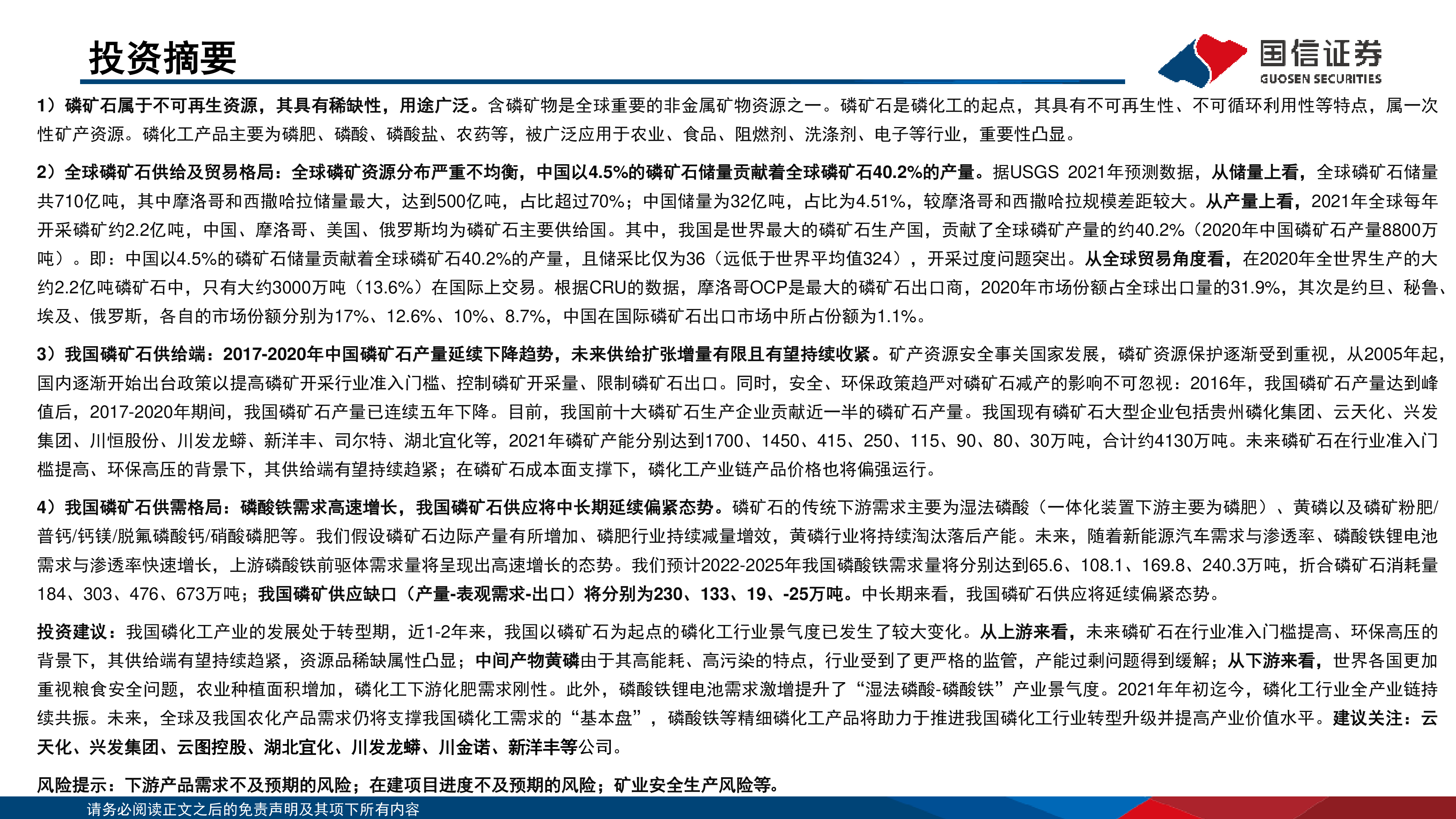 投资建议:我国磷化工产业的发展处于转型期,近1-2年来,我国以磷矿石为起点的磷化工行业景气度已发生了较大变化。从上游来看,未来磷矿石在行业准入门槛提高、环保高压的背景下,其供给端有望持续趋紧,资源品稀缺属性凸显;中间产物黄磷由于其高能耗、高污染的特点,行业受到了更严格的监管,产能过剩问题得到缓解;从下游来看,世界各国更加重视粮食安全问题,农业种植面积增加,磷化工下游化肥需求刚性。此外,磷酸铁锂电池需求激增提升了“湿法磷酸-磷酸铁”产业景气度。2021年年初迄今,磷化工行业全产业链持续共振。未来,全球及我国农化产品需求仍将支撑我国磷化工需求的“基本盘”,磷酸铁等精细磷化工产品将助力于推进我国磷化工行业转型升级并提高产业价值水平。建议关注:云天化、兴发集团、云图控股、湖北宜化、川发龙蟒、川金诺、新洋丰等公司。