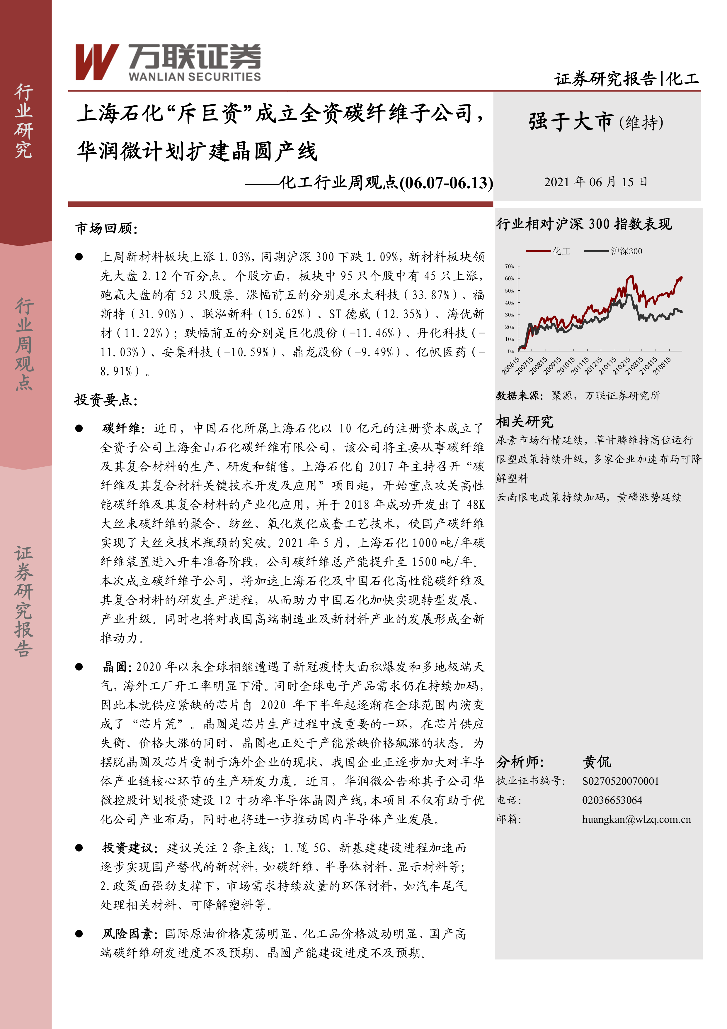 风险因素:国际原油价格震荡明显、化工品价格波动明显、国产高端碳纤维研发进度不及预期、晶圆产能建设进度不及预期。