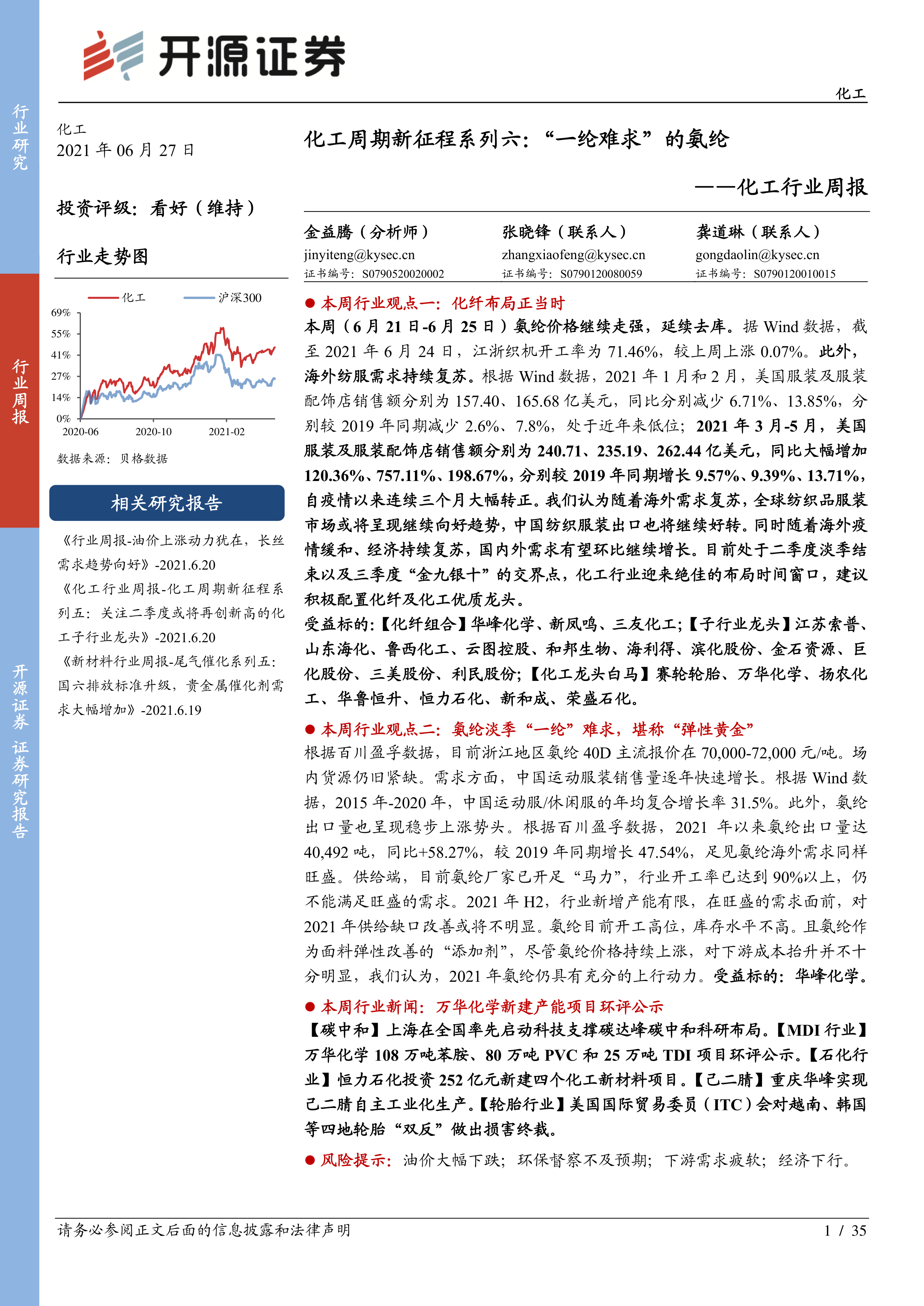 本报告基于公开数据对2021年6月21日至25日期间的化工行业市场进行了全面分析。报告认为,化工行业,特别是化纤行业,目前正处于景气上行期,投资机会良好。氨纶市场供需紧张,价格持续上涨,具有充分的上行动力。建议投资者积极配置化纤及化工优质龙头企业。报告同时提示了油价大幅下跌、环保督察不及预期、下游需求疲软以及经济下行等风险因素。 投资者应根据自身风险承受能力和投资目标做出理性投资决策。