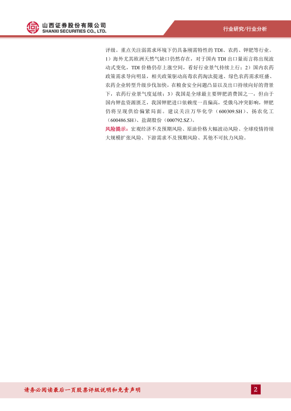 报告指出,在弱需求环境下,TDI、农药、钾肥等具备刚需特性的子行业仍具有较强的抗风险能力和发展潜力。TDI受益于海外天然气供应短缺导致的供需错配;农药行业则受益于国家政策支持和粮食安全需求;钾肥行业则受益于全球钾肥供应偏紧的局面。