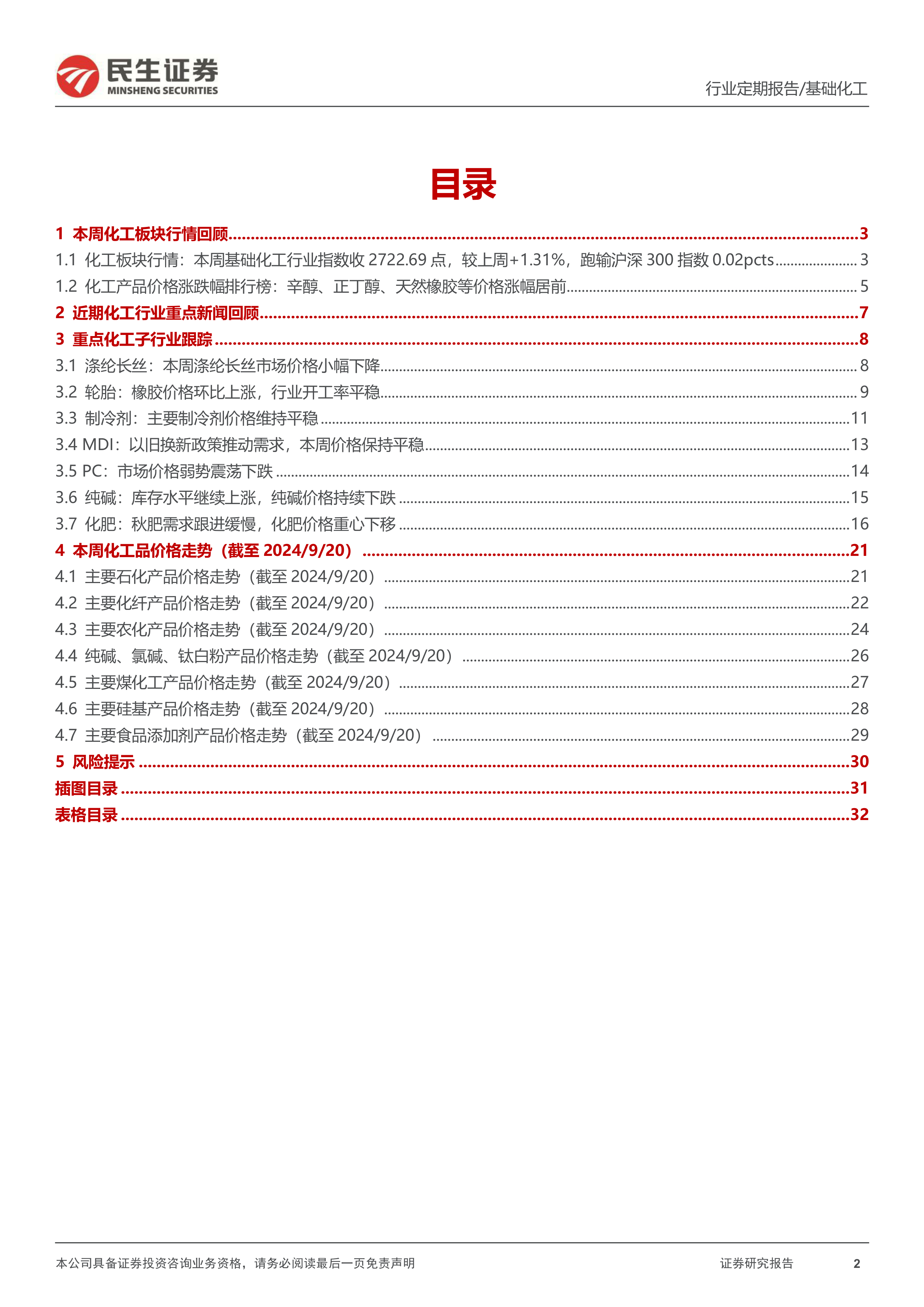 本报告对2024年9月16日至20日化工行业进行了周度总结,涵盖了市场行情、重点新闻、子行业跟踪以及产品价格走势等方面。报告指出,化工行业整体表现稳中有进,部分子行业进入旺季,但部分产品价格下行,市场面临多重风险。报告建议投资者关注旺季子行业、政策利好板块以及具有基本面拐点趋势的优质成长股,并注意下游需求、原油价格波动以及环保安全等风险。 报告中提供的图表数据为投资者提供了更全面的市场信息和分析依据。 需要注意的是,报告中的数据和分析仅供参考,不构成投资建议。