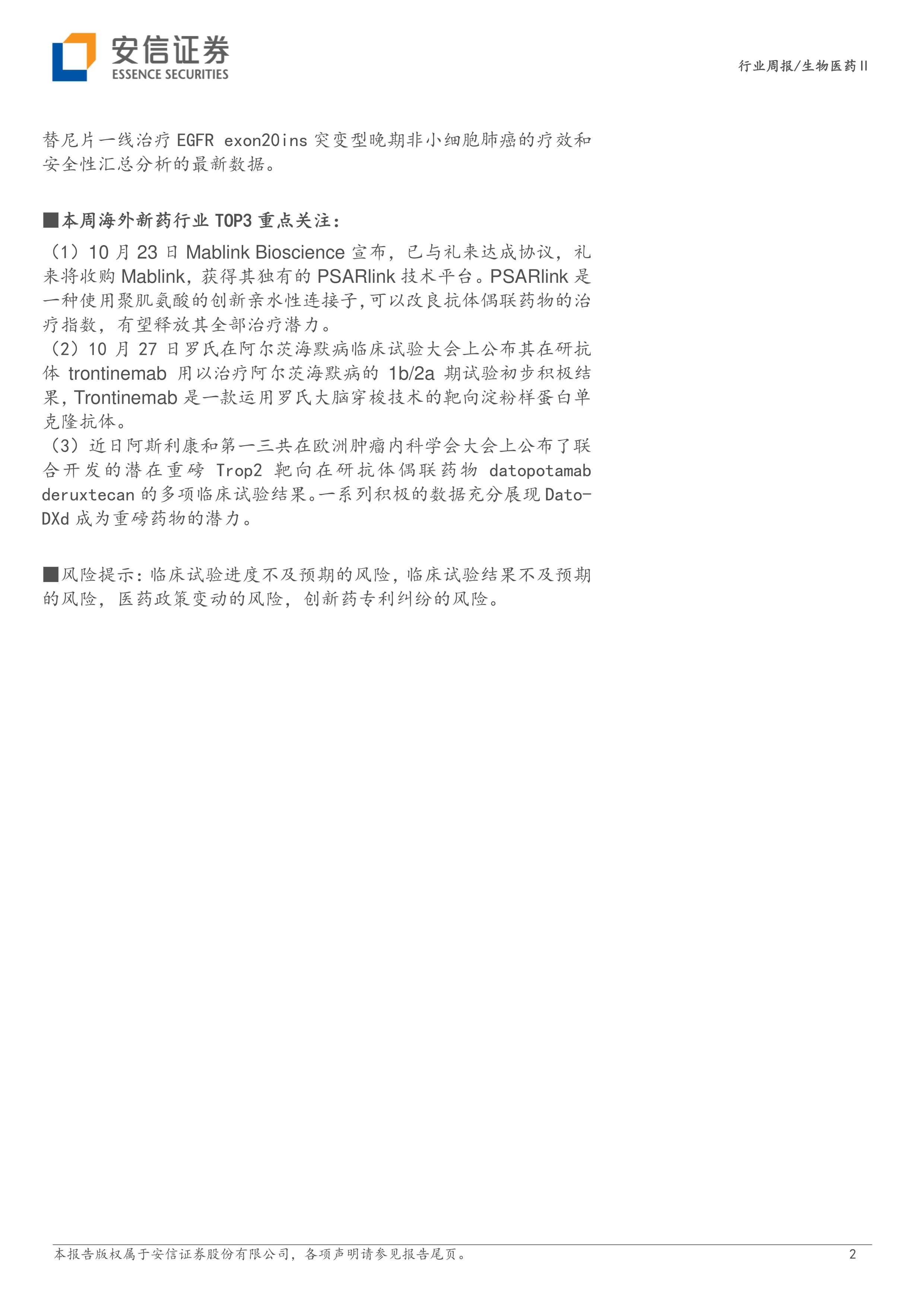报告重点关注了阿斯利康/第一三共datopotamab deruxtecan临床数据披露、礼来收购Mablink布局ADC、罗氏trontinemab临床数据披露等多个海外新药行业事件,并对相关公司进行了简要分析。