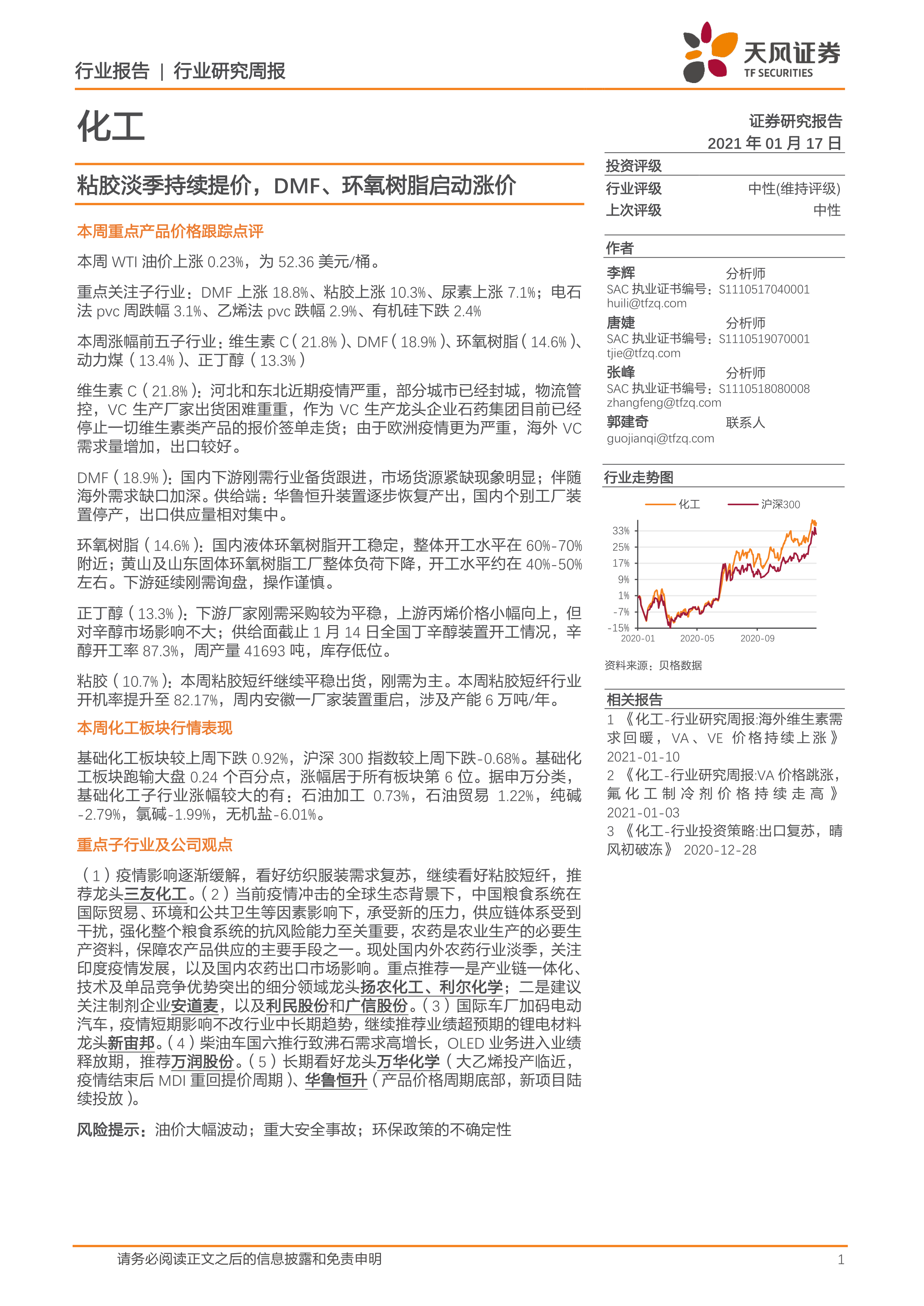 本报告通过对化工行业板块行情、重点产品价格、重点公司以及行业新闻的分析,揭示了化工行业在2021年1月17日一周内的市场特征。行业整体表现略逊于大盘,但部分子行业表现强劲,呈现出结构性分化。价格波动受供需关系、疫情、环保政策等多重因素影响。报告提供的投资建议需结合投资者自身情况谨慎考虑,并注意报告中提到的风险提示。 报告数据详实,分析深入,为投资者提供了有价值的参考信息。