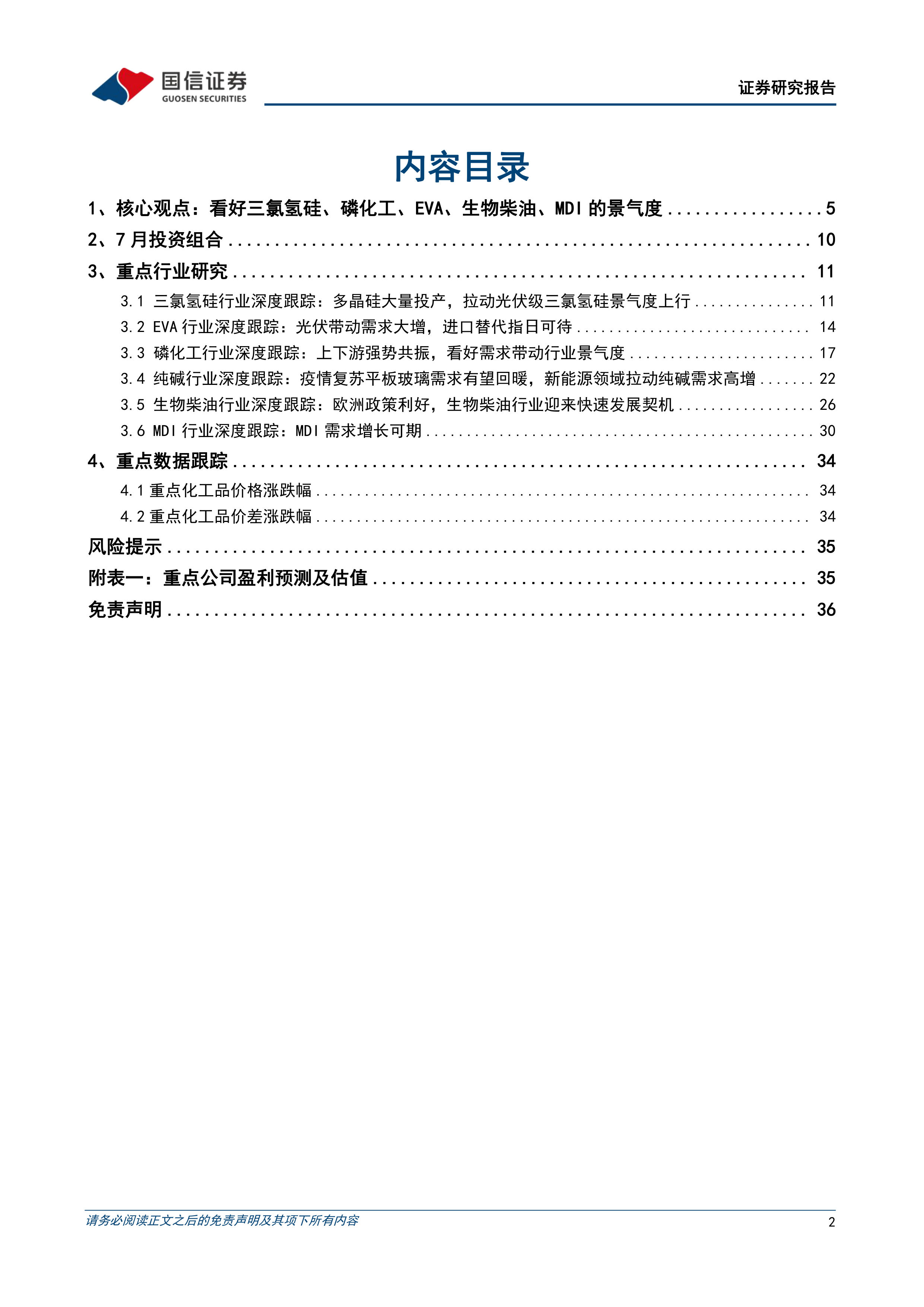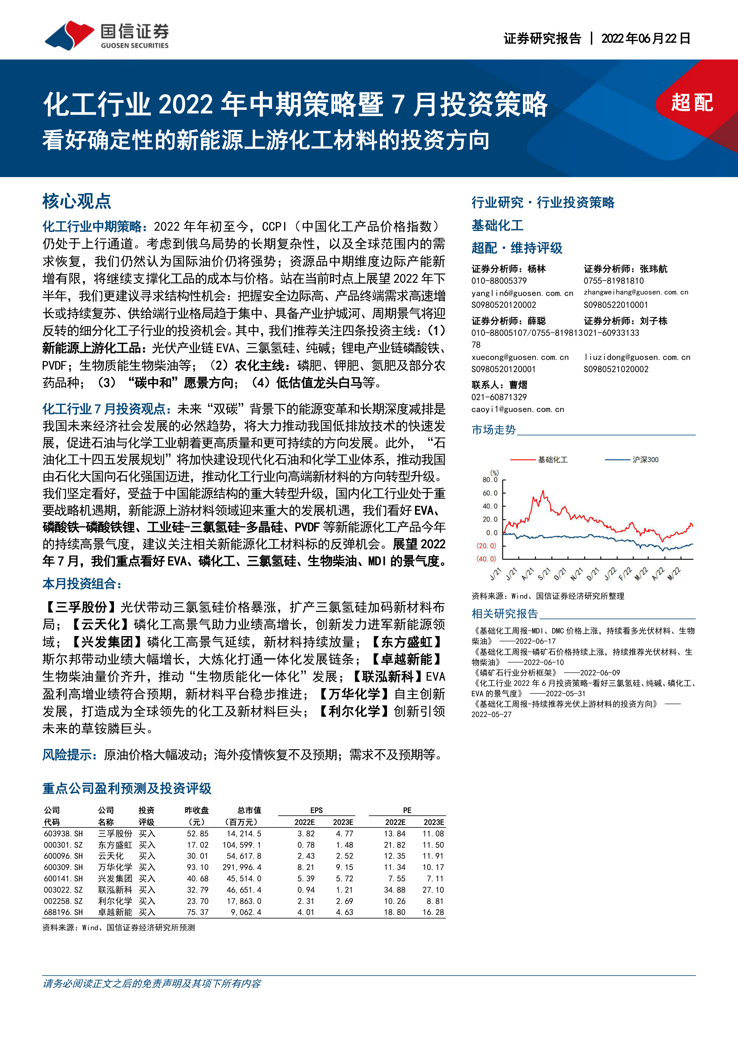 化工行业 7 月投资观点: 未来“双碳” 背景下的能源变革和长期深度减排是我国未来经济社会发展的必然趋势, 将大力推动我国低排放技术的快速发展, 促进石油与化学工业朝着更高质量和更可持续的方向发展。 此外, “石油化工十四五发展规划” 将加快建设现代化石油和化学工业体系, 推动我国由石化大国向石化强国迈进, 推动化工行业向高端新材料的方向转型升级。我们坚定看好, 受益于中国能源结构的重大转型升级, 国内化工行业处于重要战略机遇期, 新能源上游材料领域迎来重大的发展机遇, 我们看好 EVA、磷酸铁-磷酸铁锂、 工业硅-三氯氢硅-多晶硅、 PVDF 等新能源化工产品今年的持续高景气度, 建议关注相关新能源化工材料标的反弹机会。 展望 2022年 7 月, 我们重点看好 EVA、 磷化工、 三氯氢硅、 生物柴油、 MDI 的景气度。本月投资组合: