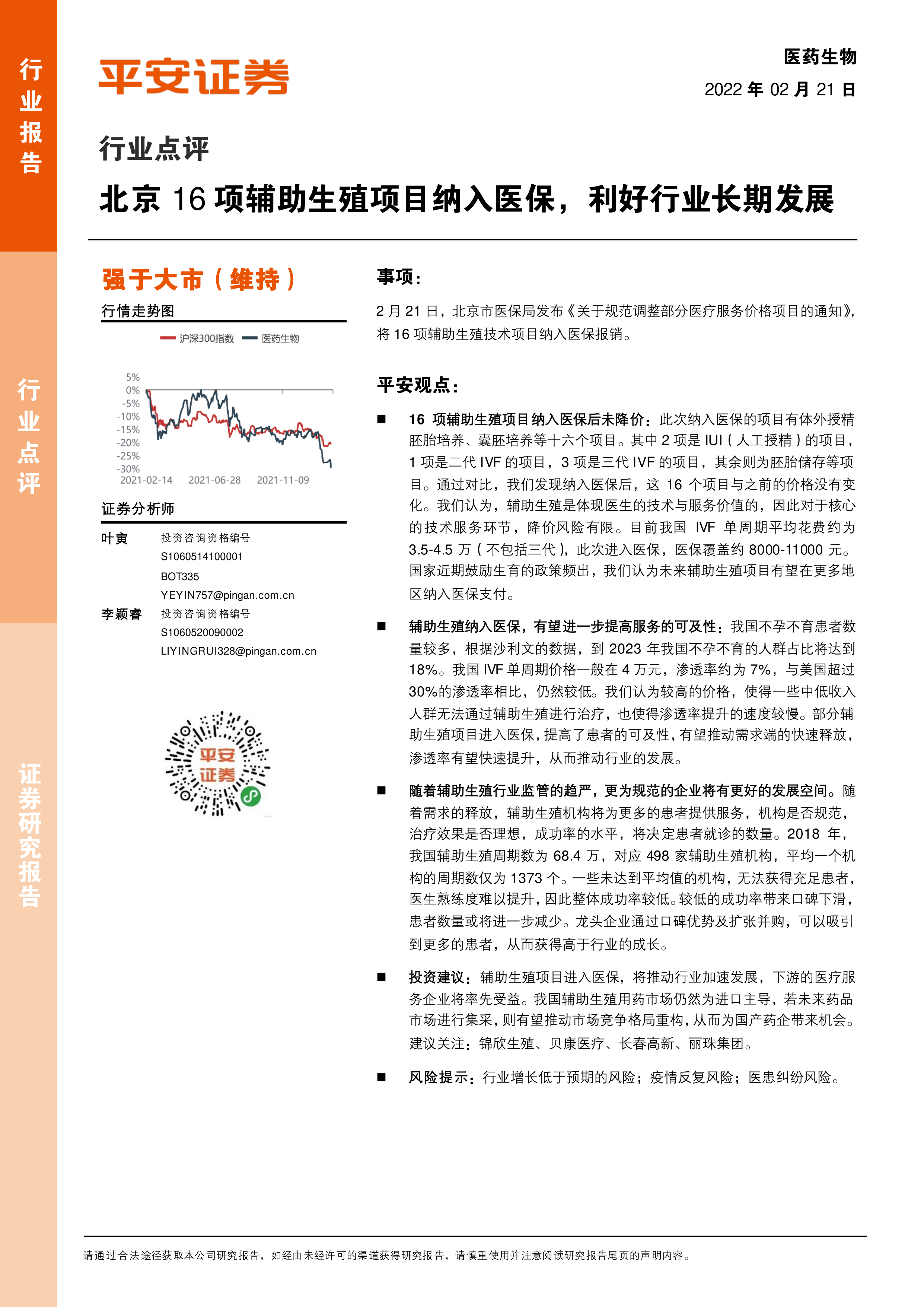 医药生物行业点评:北京16项辅助生殖项目纳入医保,利好行业长期发展