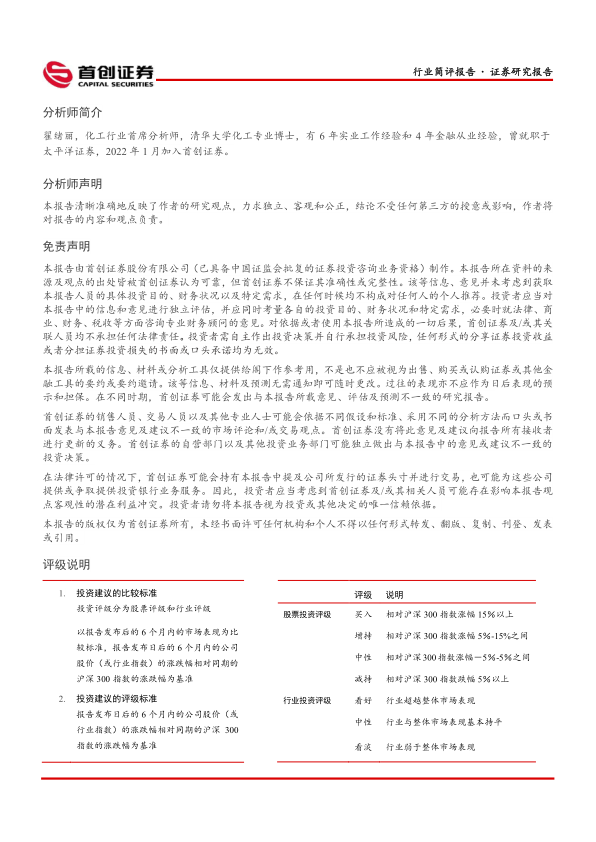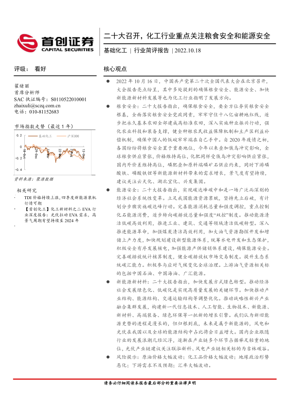 本报告基于党的二十大报告,对化工行业未来发展趋势进行了分析。报告认为,粮食安全、能源安全和新能源新材料发展战略将为化工行业带来新的发展机遇,但也面临着诸多挑战和风险。报告建议投资者关注相关领域的龙头企业,并密切关注市场变化和风险因素。 报告中推荐的投资标的仅供参考,投资者应根据自身情况进行独立判断,并承担相应的投资风险。 报告还详细介绍了分析师资质、免责声明以及评级说明,确保报告的专业性和透明度。