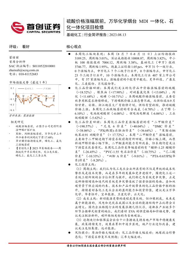 基础化工行业简评报告:硫酸价格涨幅居前,万华化学烟台MDI一体化、石化一体化项目检修