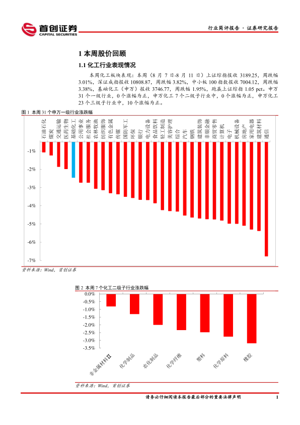 本周化工板块表现:本周(8 月 7 日-8 月 11 日)上证综指报收3189.25,周跌幅 3.01%,深证成指报收10808.87,周跌幅 3.82%,中小板 100 指数报收 7004.12,周跌幅 3.38%,基础化工(申万)报收3746.77,周跌幅 1.95%,跑赢上证综指 1.05 pct。申万 31个一级行业,0 个涨幅为正,申万化工 7 个二级子行业中,0 个涨幅为正,申万化工23 个三级子行业中,10 个涨幅为正。本周化工行业 407 家上市公司中,有 57 家涨幅为正。涨幅居前的个股有中毅达、昊华科技、广康生化、三美股份、巨化股份等。