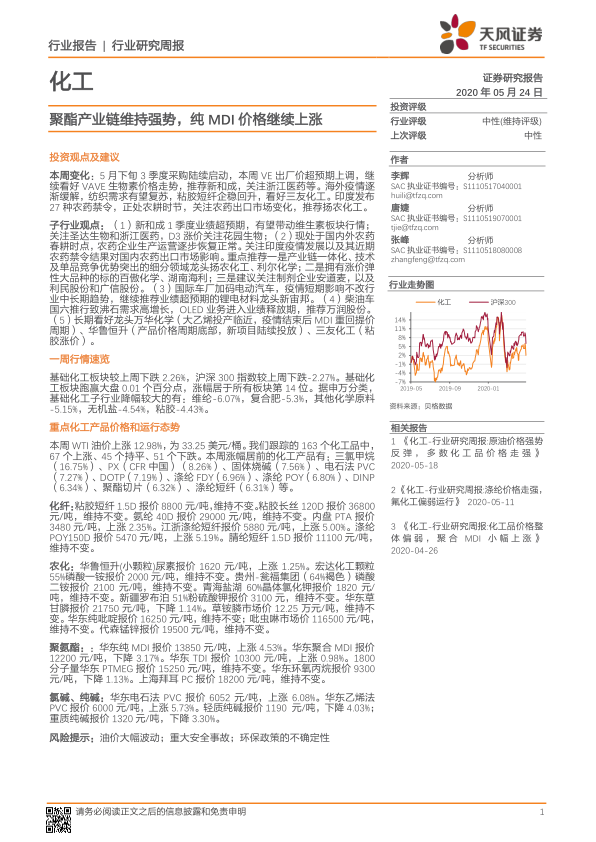 化工行业研究周报:聚酯产业链维持强势,纯MDI价格继续上涨
