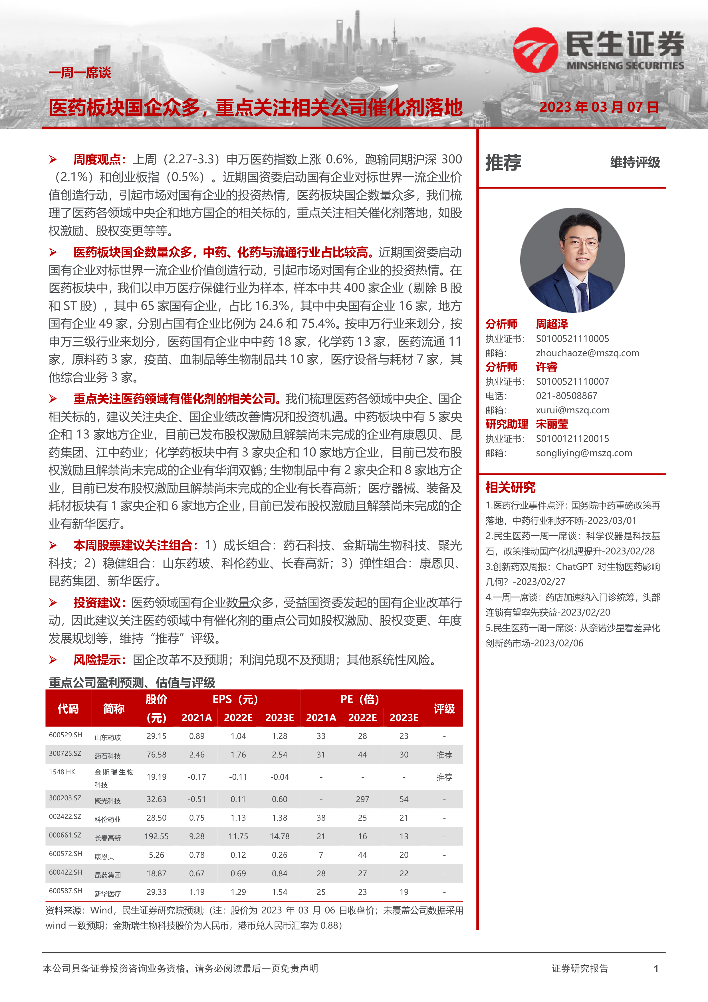 周度观点: 上周(2.27-3.3)申万医药指数上涨 0.6%,跑输同期沪深 300(2.1%)和创业板指(0.5%) 。 近期国资委启动国有企业对标世界一流企业价值创造行动,引起市场对国有企业的投资热情,医药板块国企数量众多,我们梳理了医药各领域中央企和地方国企的相关标的,重点关注相关催化剂落地,如股权激励、股权变更等等。