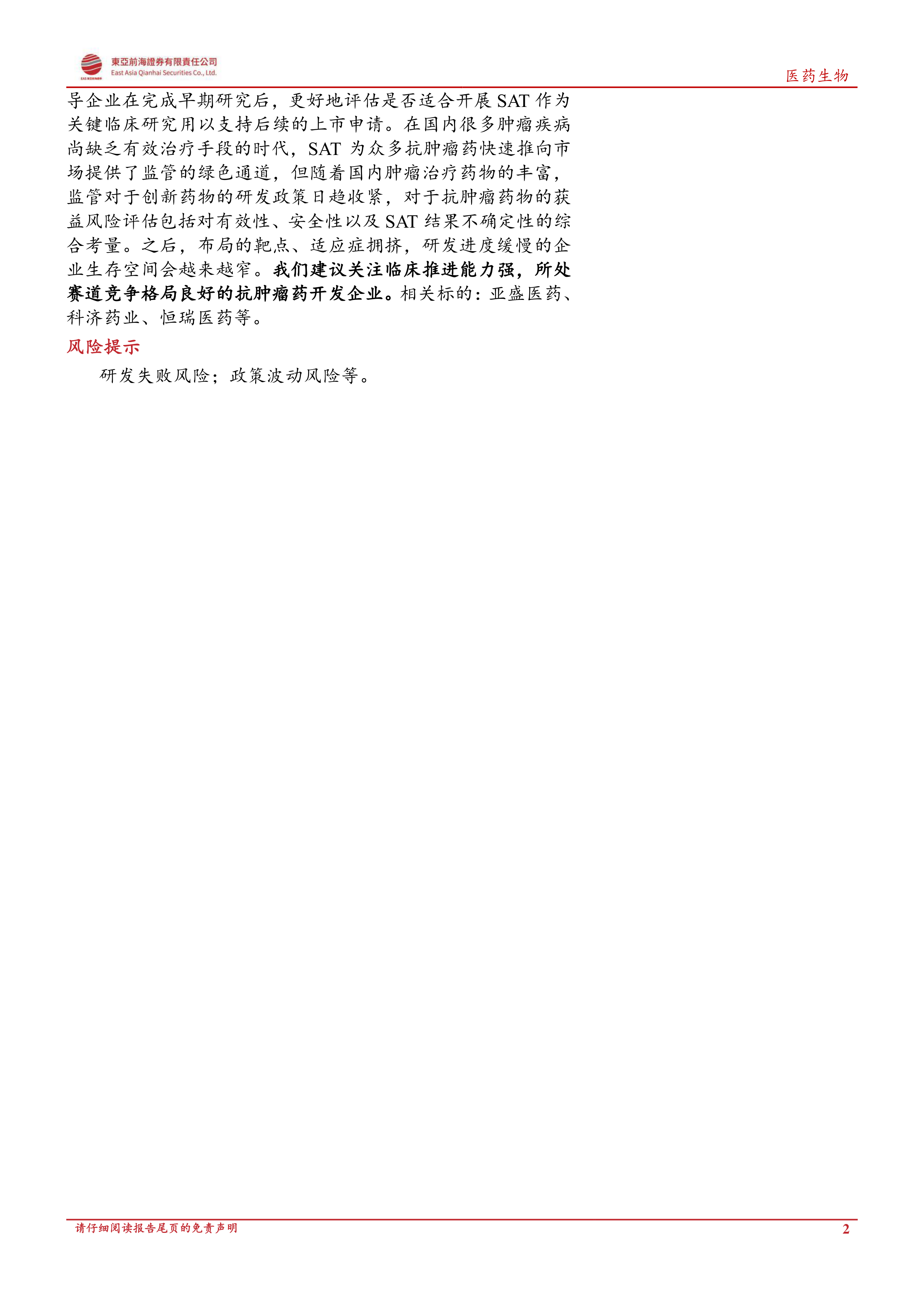 SAT 用于支持抗肿瘤药上市申请的适用性的科学认识,以期指导企业在完成早期研究后,更好地评估是否适合开展 SAT 作为关键临床研究用以支持后续的上市申请。在国内很多肿瘤疾病尚缺乏有效治疗手段的时代, SAT 为众多抗肿瘤药快速推向市场提供了监管的绿色通道,但随着国内肿瘤治疗药物的丰富,监管对于创新药物的研发政策日趋收紧,对于抗肿瘤药物的获益风险评估包括对有效性、安全性以及 SAT 结果不确定性的综合考量。之后,布局的靶点、适应症拥挤,研发进度缓慢的企业生存空间会越来越窄。 我们建议关注临床推进能力强,所处赛道竞争格局良好的抗肿瘤药开发企业。 相关标的:亚盛医药、科济药业、恒瑞医药等。
